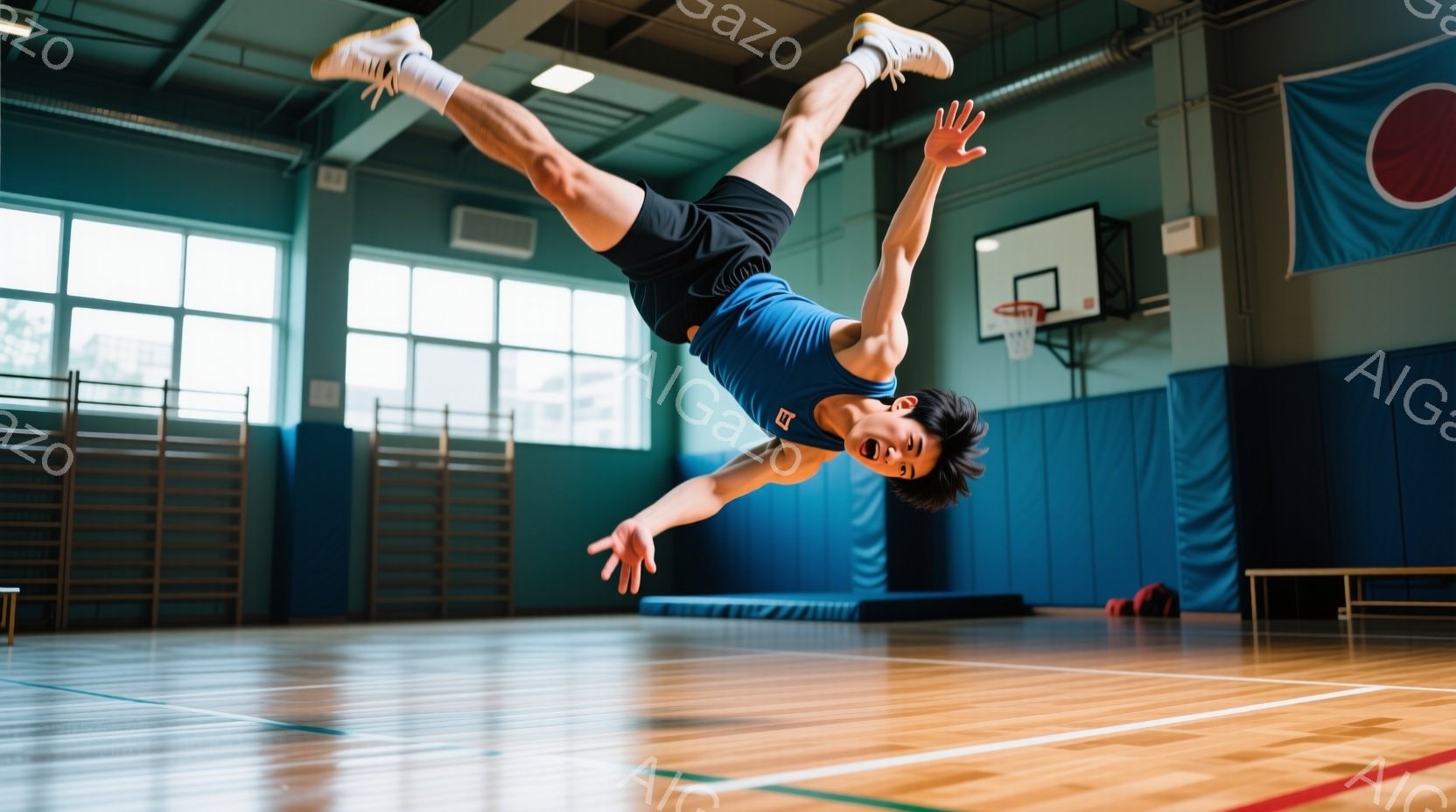 この無料AI生成画像「体育館で空中で技を行っている若い男性が写っています。彼は紺色の体操服と白い靴下を履き、黒い髪を短く整えています。空中で体を大きく反らせ、両腕を広げ、表情は真剣で集中しています。」は、2025年10月26日に作成されました。 サイズは 1664×928px の高解像度で、商用利用も可能なフリー素材として提供しています。