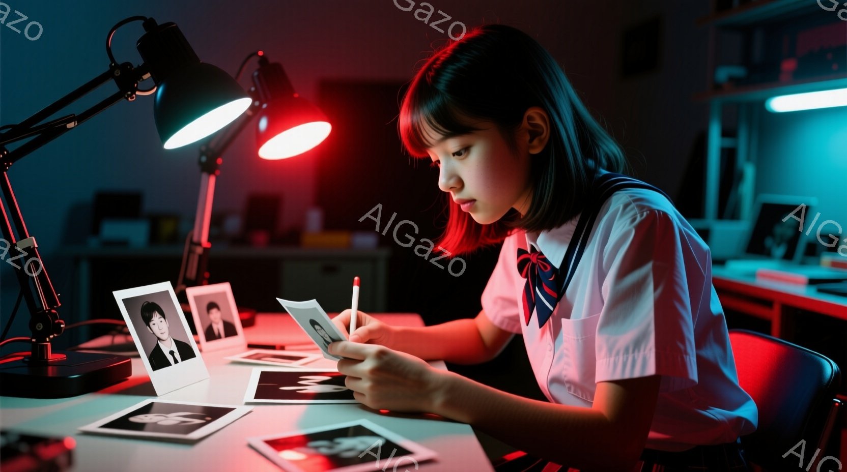 少女は机の上で写真を手に取り、集中して見つめている。白いシャツにネクタイ、制服のような服装で、髪は後ろでポニーテールに結ばれている。背景は暗く、机の上の写真とペン、そして背中のリュックサックがわずかに光を受けている。