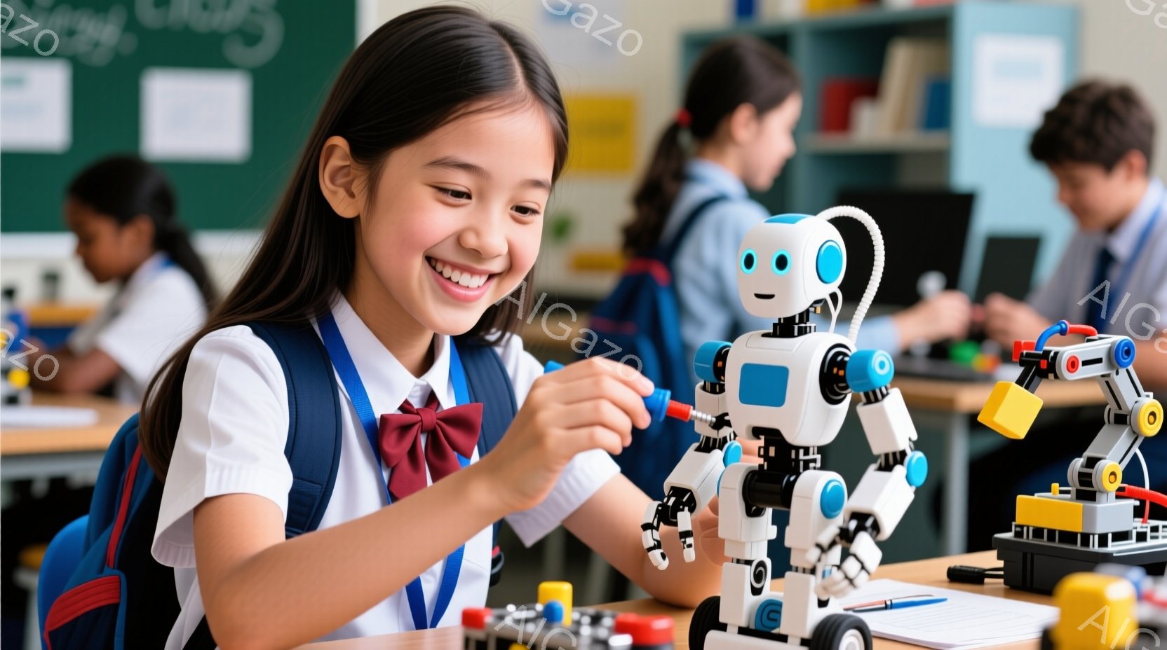 少女は明るい笑顔で白いロボットと遊んでいます。彼女は水色のシャツに紺色のベストを着ており、髪は肩まで伸ばして自然なウェーブがかかっています。背景には、他の生徒たちがいる教室と、カラフルな積み木が飾られた黒板が見え、創造性と学習を促進する活気ある雰囲気です。