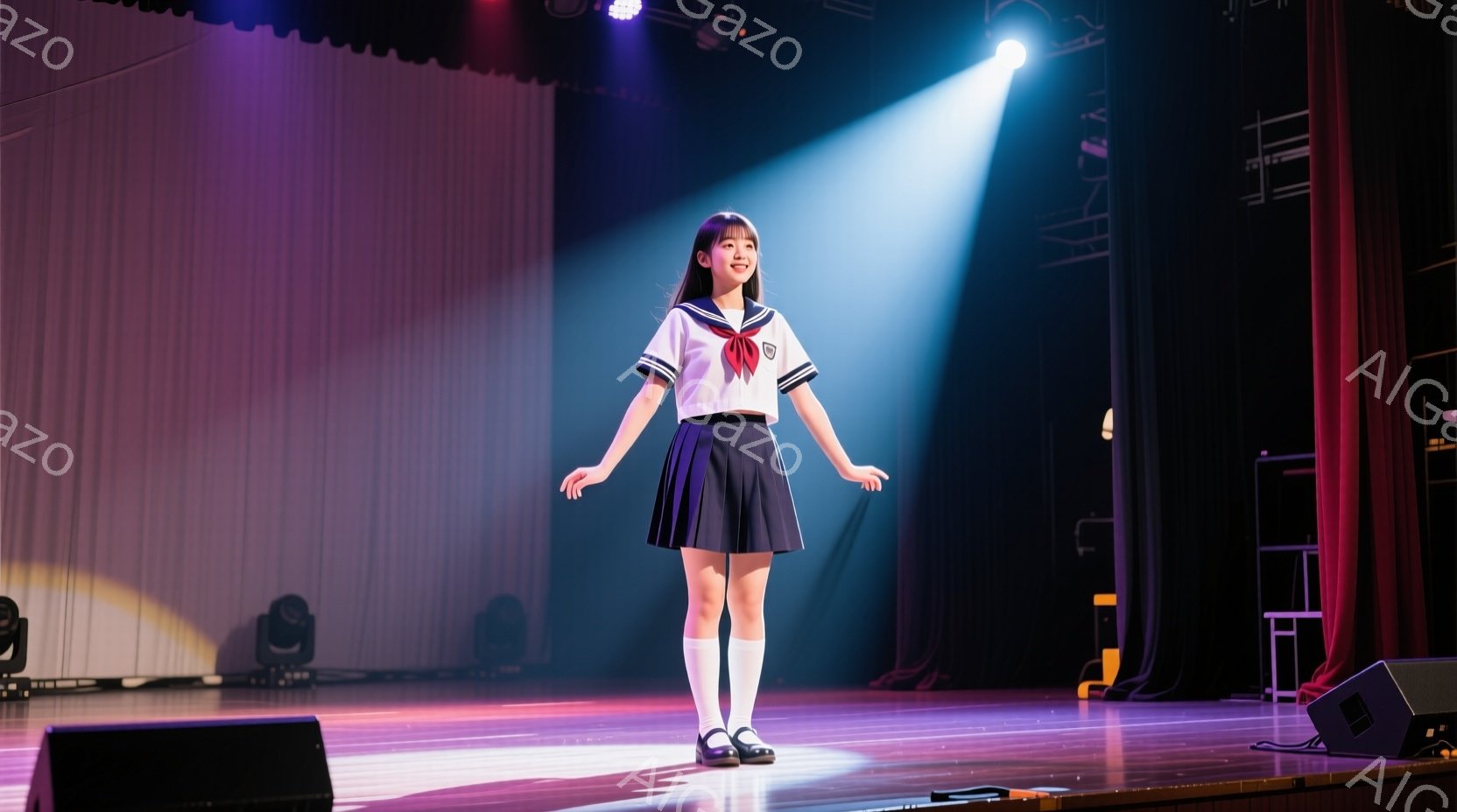 舞台中央に立つ女子高生が映っています。彼女は白いブラウスと紺色のプリーツスカート、白いハイソックス、黒いローファーを着用し、笑顔で正面を見つめています。背景は暗い劇場で、赤いカーテンと上からのスポットライトが彼女を照らし、華やかな雰囲気を作り出しています。