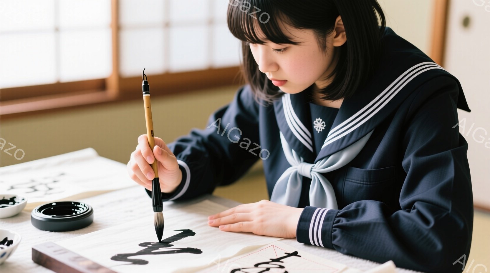 少女はセーラー服を着て、書道に取り組んでいます。彼女は集中した表情で筆を握り、半紙に向かっています。背景には畳の部屋と窓が見え、落ち着いた、伝統的な雰囲気です。