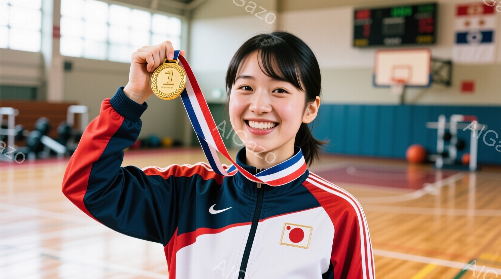 メダルを首から下げた若い女性が写っています。彼女は赤いラインが入った白いトラックジャケットを着ており、髪は肩までの長さで、前髪が少しあります。笑顔でカメラに向かっており、背景には体育館らしき場所があり、バスケットボールゴールや体操用具が見えます。
