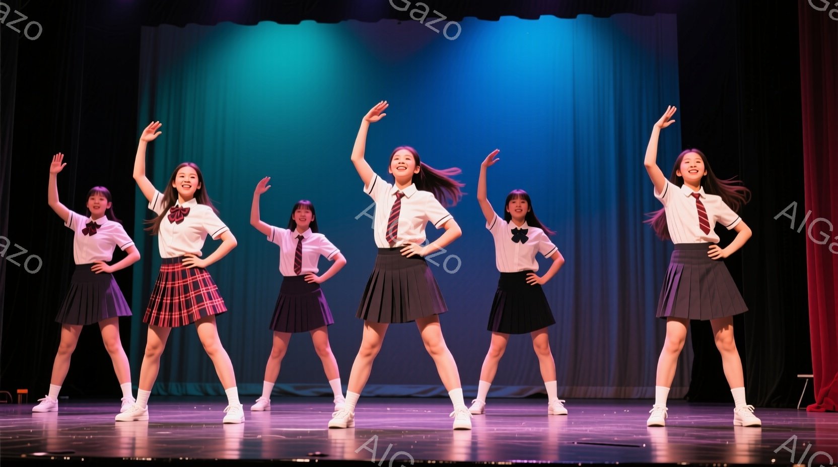この無料AI生成画像「紺色のプリーツスカートと白いブラウス、そしてネクタイを着用した女性たちが、ステージ上で一列に並んで立っています。彼女たちは皆、同じような姿勢で、少し腰を落とし、手を腰に当てています。背景には、淡い水色のカーテンと、上部にカラフルな照明が設置されたステージが見えます。」は、2025年10月26日に作成されました。 サイズは 1664×928px の高解像度で、商用利用も可能なフリー素材として提供しています。