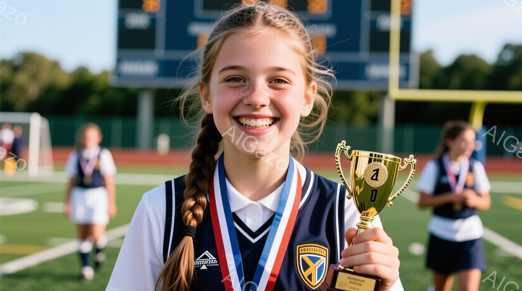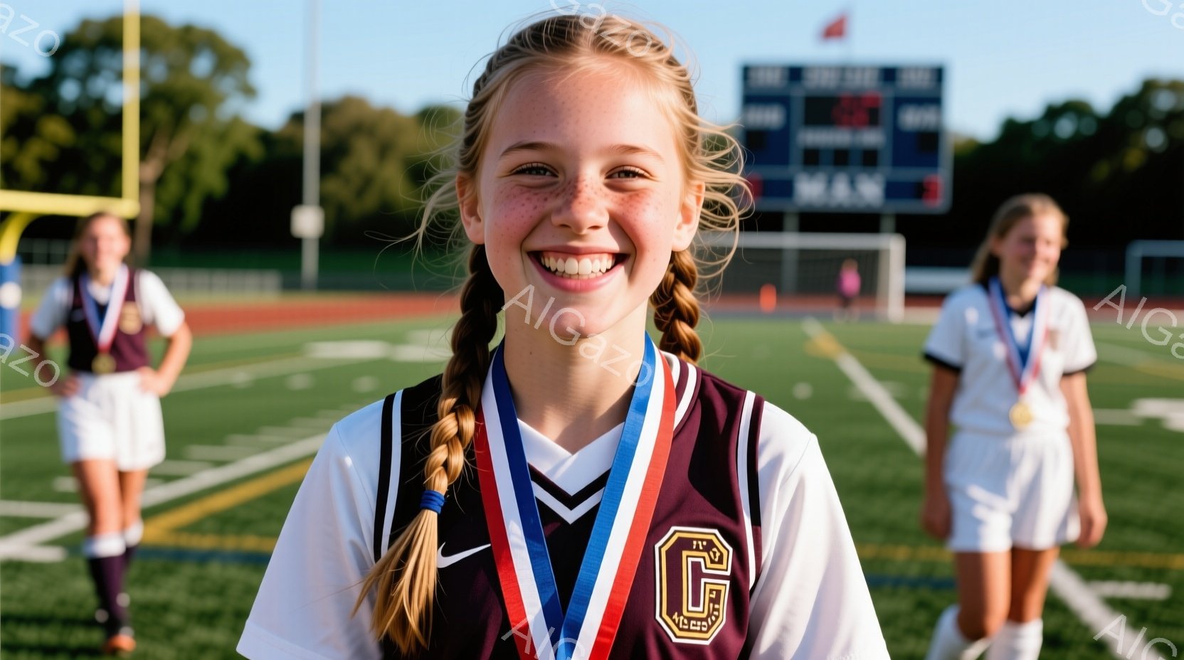 この無料AI生成画像「明るい笑顔の少女が、紺色の襟付きシャツと短パン姿で立っている。首には金メダルがかけられ、髪は両サイドで三つ編みにされている。背景には緑の芝生とトラック、そして遠くに見える建物があり、晴れた日のスポーツイベントの後の様子を伝えている。」は、2025年10月26日に作成されました。 サイズは 1664×928px の高解像度で、商用利用も可能なフリー素材として提供しています。