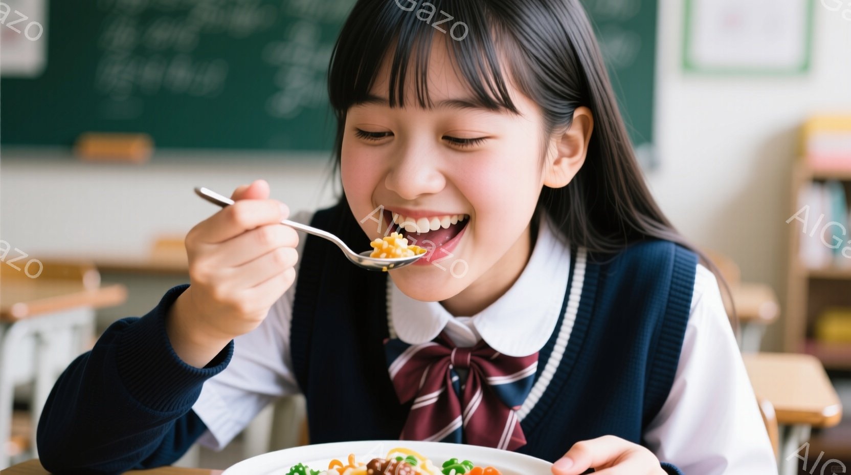 制服を着た若い女性が、フォークで食事を楽しんでいます。彼女は明るい笑顔を見せ、前髪を少し横に流した黒髪が印象的です。背景には教室の椅子や黒板が見え、学校のランチタイムのような温かい雰囲気です。