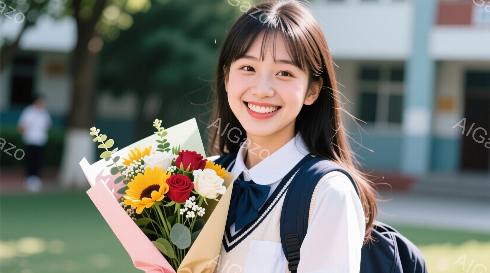 若い女性が、様々な色の花束を抱えて微笑んでいます。彼女は白いシャツに濃い青のリボン、そして黒いバックパックを身につけ、長い髪をサイドに分けています。背景には緑豊かな木々が見え、晴れた日の穏やかな雰囲気が漂っています。