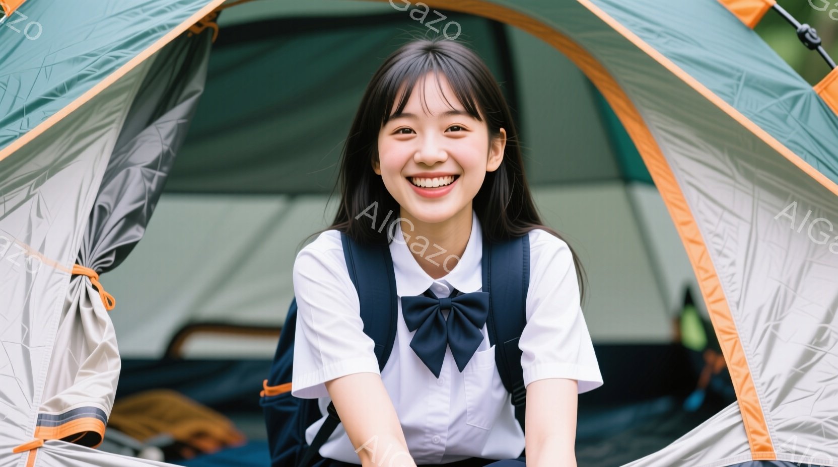 若い女性がテントの中に笑顔で座っています。紺色のリボンが特徴の白いブラウスとスカートの制服姿で、黒いバックパックを背負っています。テント内は明るく、背景には自然が見え、全体的に爽やかで楽しい雰囲気が漂っています。
