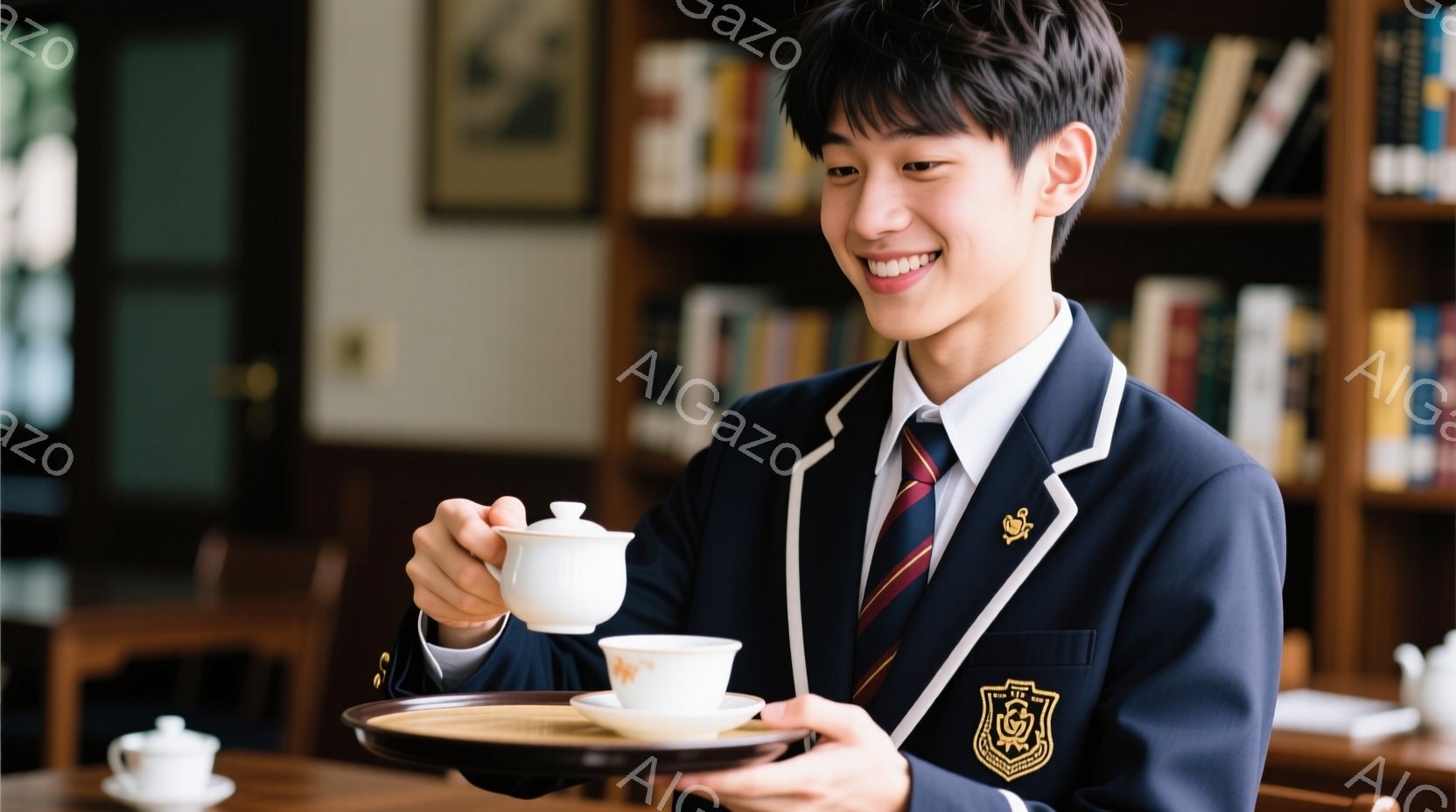 若い男性が紺色のベストと白いシャツ、ネクタイ姿で、白いお盆にティーポットとティーカップを乗せて笑顔で立っています。彼は少し上を見て微笑んでおり、姿勢は良く、自信に満ち溢れています。背景には木製のドアと窓が見え、明るい自然光が差し込み、暖かく穏やかな雰囲気を醸し出しています。