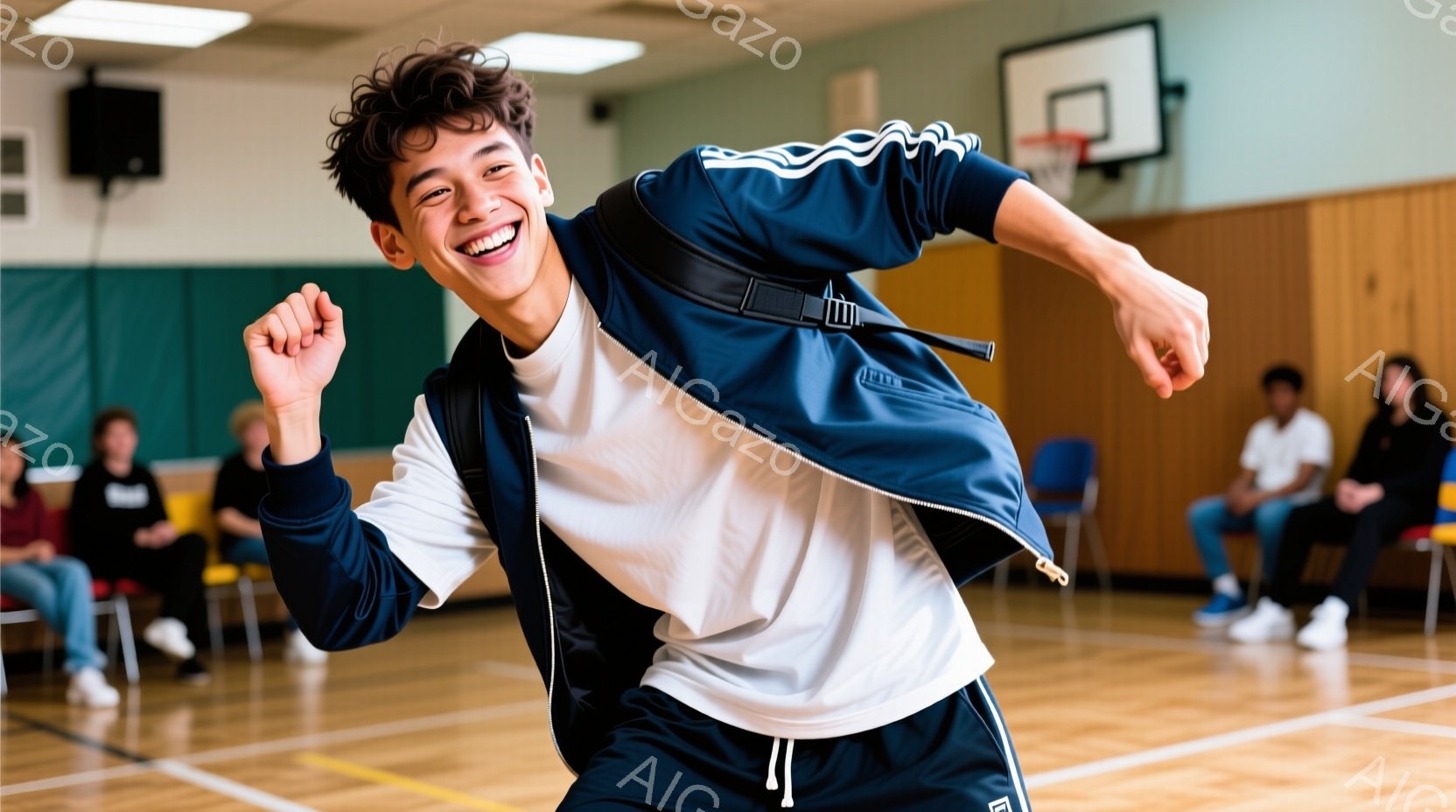 体育館の床で、若い男性が笑顔でポーズをとっています。彼は白いTシャツ、ジーンズ、そして赤、白、青のジャケットを着用し、髪は無造作にとかされています。背景には、他の生徒たちがぼやけて写っており、全体的に活気に満ちた、若々しい雰囲気が漂っています。