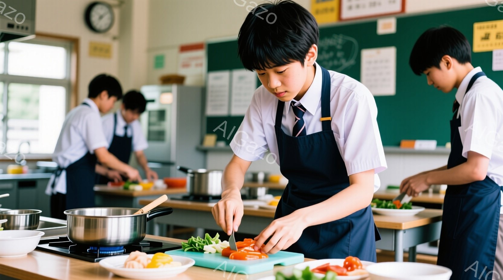 この無料AI生成画像「制服を着た少年がキッチンで野菜を切っています。彼は白いシャツに紺色のベストとネクタイ、そしてエプロンを着用しており、黒髪を短く切っています。背景にはキッチン設備や冷蔵庫、そして黒板が見え、料理クラブの活動をしている様子が伺えます。」は、2025年10月26日に作成されました。 サイズは 1664×928px の高解像度で、商用利用も可能なフリー素材として提供しています。
