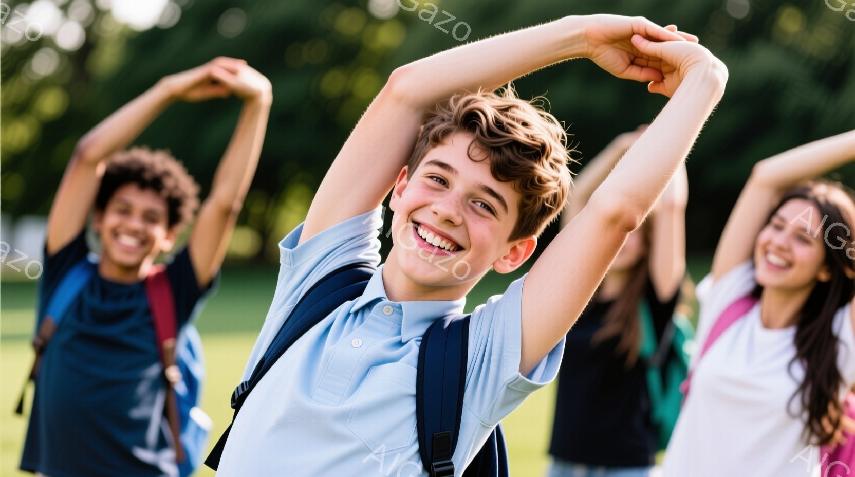 少年たちが青々とした芝生の上で腕を広げ、体を伸ばしている様子が写っている。彼らはそれぞれリュックサックを背負っており、カジュアルな服装で、表情は明るく、楽しんでいる様子が伺える。背景にはレンガ造りの建物が見え、晴れた空の下、暖かい日差しが差し込んでいる。