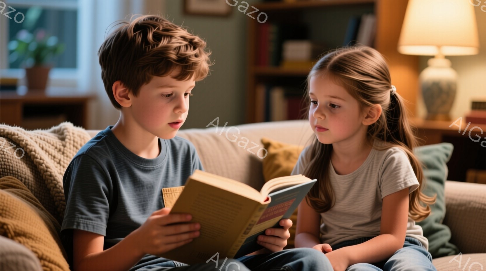 教室で、少年と少女が本を読みながら楽しそうに笑っています。少年は茶色の巻き毛で青いシャツを着ており、少女は黒髪でピンクのシャツを着ています。背景には、黒板と他の生徒たちがおり、明るく陽気な雰囲気です。