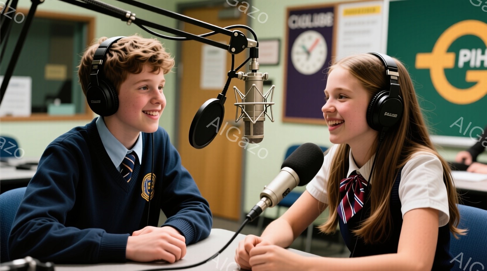 少年と少女がマイクに向かって座っており、それぞれヘッドホンを着用しています。少年は紺色のセーターを着ており、赤毛で微笑んでいます。背景には、クラブを示す緑色の看板があり、教室のような環境であることがわかります。