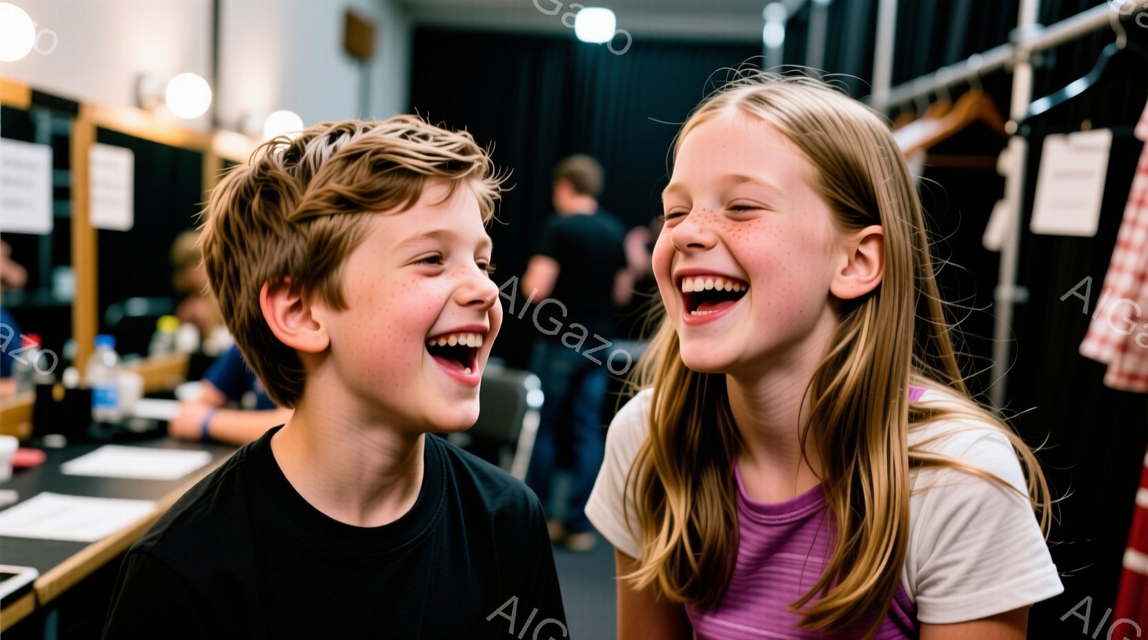 二人の子供が笑いながら互いに顔を寄せ合っている。男の子は黒いTシャツを着ており、少し癖のある茶色の髪をしている。女の子はピンク、白、黄色のストライプのTシャツを着て、長くストレートの髪をしている。