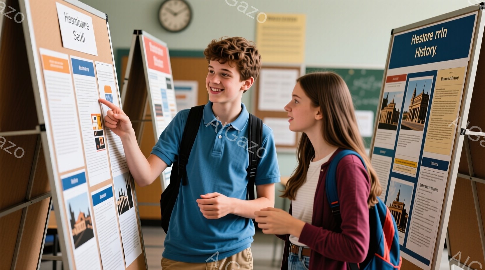少年と少女が、展示会でポスターを前に楽しそうに会話しています。少年はベージュ色のズボンに紺色のブレザー、赤いネクタイと白いシャツ姿で、少し巻き毛の茶髪です。少女はデニムのスカートに白いTシャツ、赤いカーディガンを着ており、髪は後ろで三つ編みにしています。