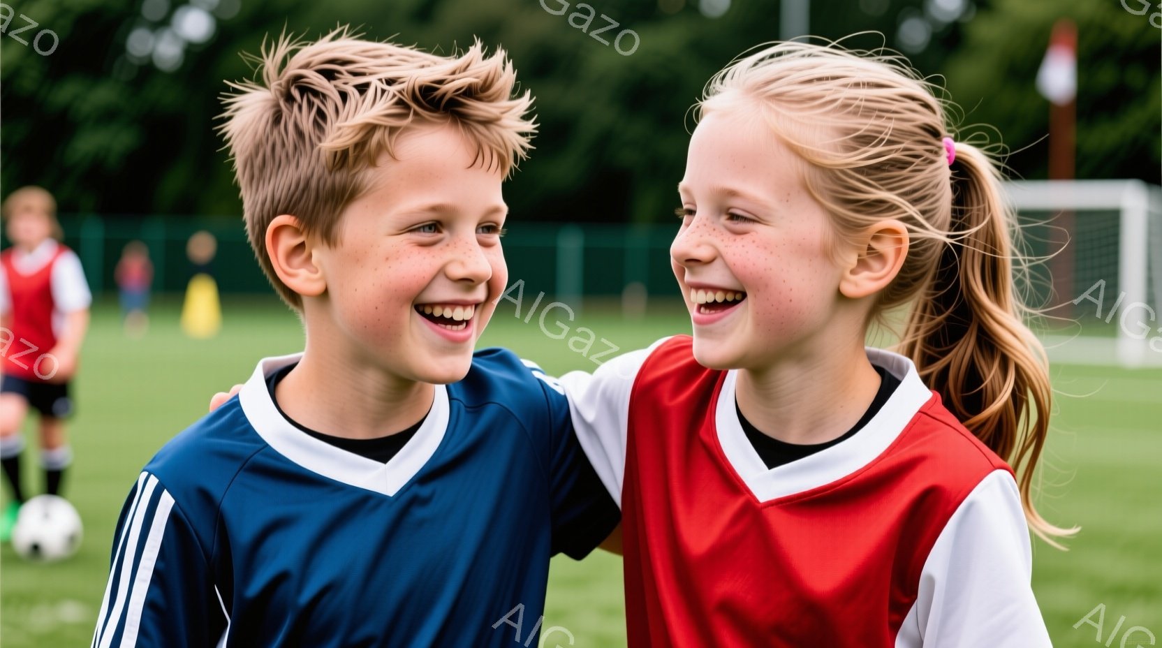 少年と少女がサッカーの練習後か試合後のように、肩を組んで笑顔で立っています。少年は青いサッカーシャツに短髪で、少女は赤いサッカーシャツにポニーテールをしており、どちらも頬にそばかすがあります。背景には緑の芝生、サッカーゴール、そして他の子供たちが写っており、晴れた日の屋外で、明るく活気のある雰囲気が漂っています。