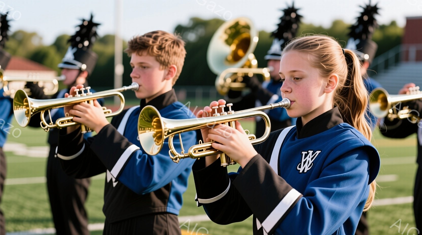 マーチングバンドのメンバーである少年少女が、屋外の緑色の芝生の上でトランペットを演奏している。彼らは濃い青色の制服を着ており、胸には白い文字でロゴが入っている。背景には、他のバンドメンバーや不明瞭な建物が見え、晴れた日の穏やかな雰囲気が漂っている。