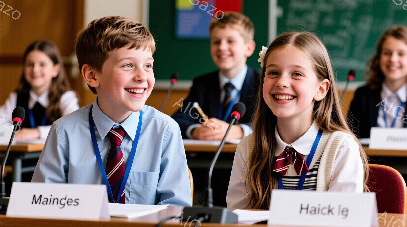 少年と少女がテーブルを挟んで笑顔で話しています。少年はネクタイと紺色のジャケットを着ており、少女は白いシャツに紺色のジャケットを羽織り、楽しそうに笑っています。背景には他の参加者が座っており、アメリカの国旗がかすかに見え、会議やフォーラムのようなフォーマルな雰囲気です。