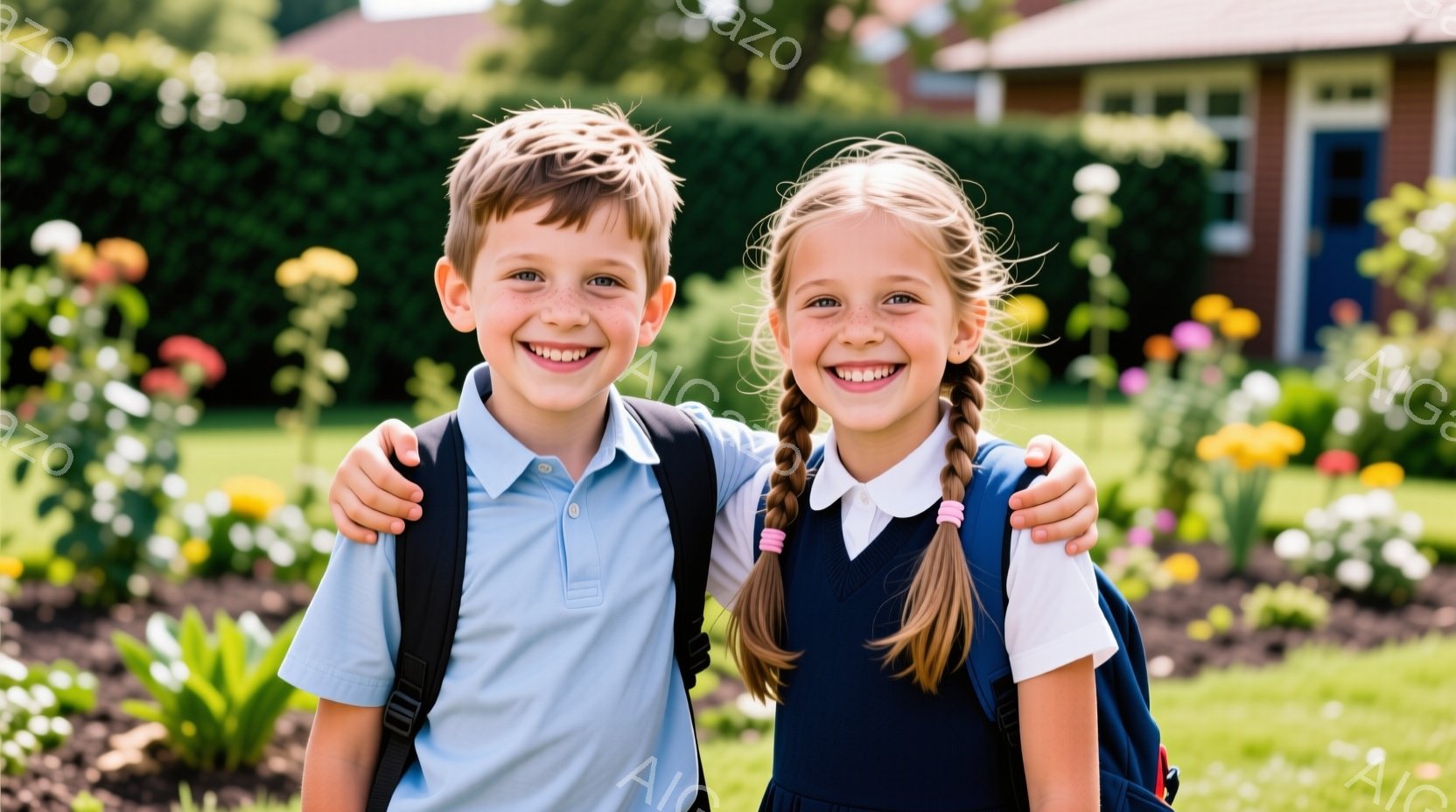 少年と少女が庭で寄り添って微笑んでいる。少年は水色のポロシャツに黒いバックパックを背負い、少女は白いTシャツと濃い青色のカーディガンを着ている。背景には花壇、緑の芝生、そしてレンガ造りの家が見え、晴れた日の穏やかな雰囲気が漂っている。