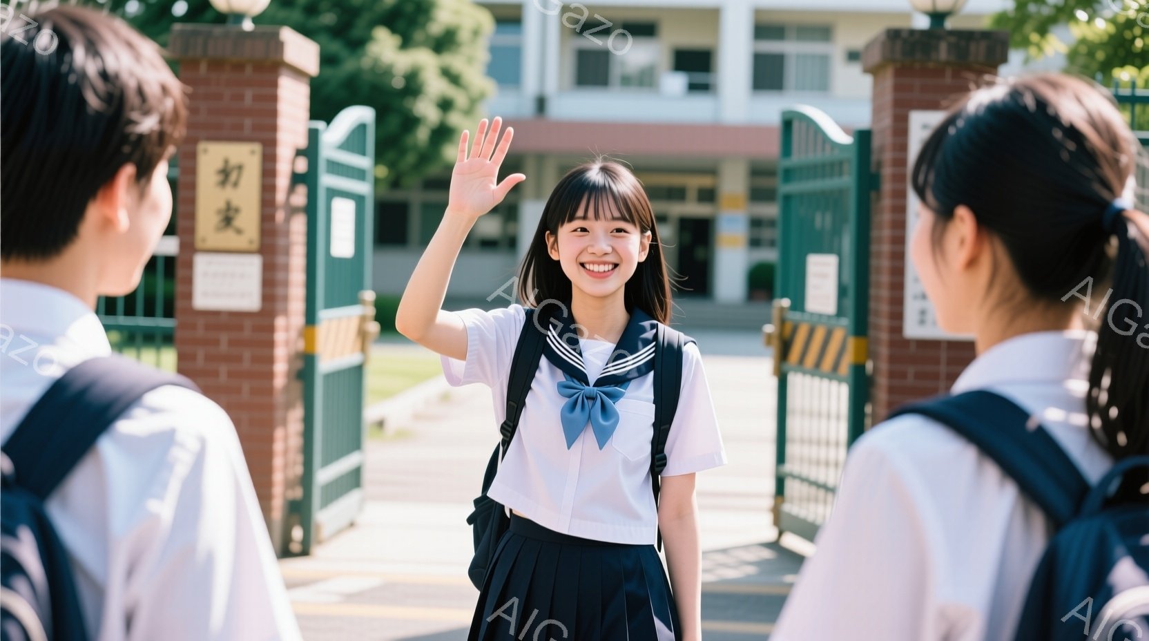 制服を着た女子学生が、笑顔で手を振っています。彼女はショートヘアで、紺色のリボンと白いブラウス、プリーツスカートを着用しています。背景には煉瓦造りの建物と青空が広がり、晴れた日の学校の風景を表しています。