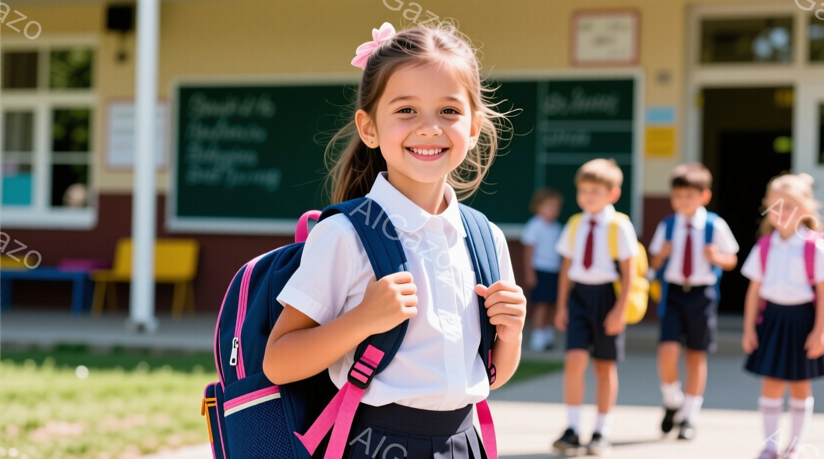 小さな女の子が微笑みながらカメラを見ています。彼女は白いシャツ、紺色のスカート、そしてピンクのアクセントが入った青いバックパックを着ています。背景には学校の建物と他の生徒たちがぼやけて見え、晴れた日の学校の様子が伝わってきます。