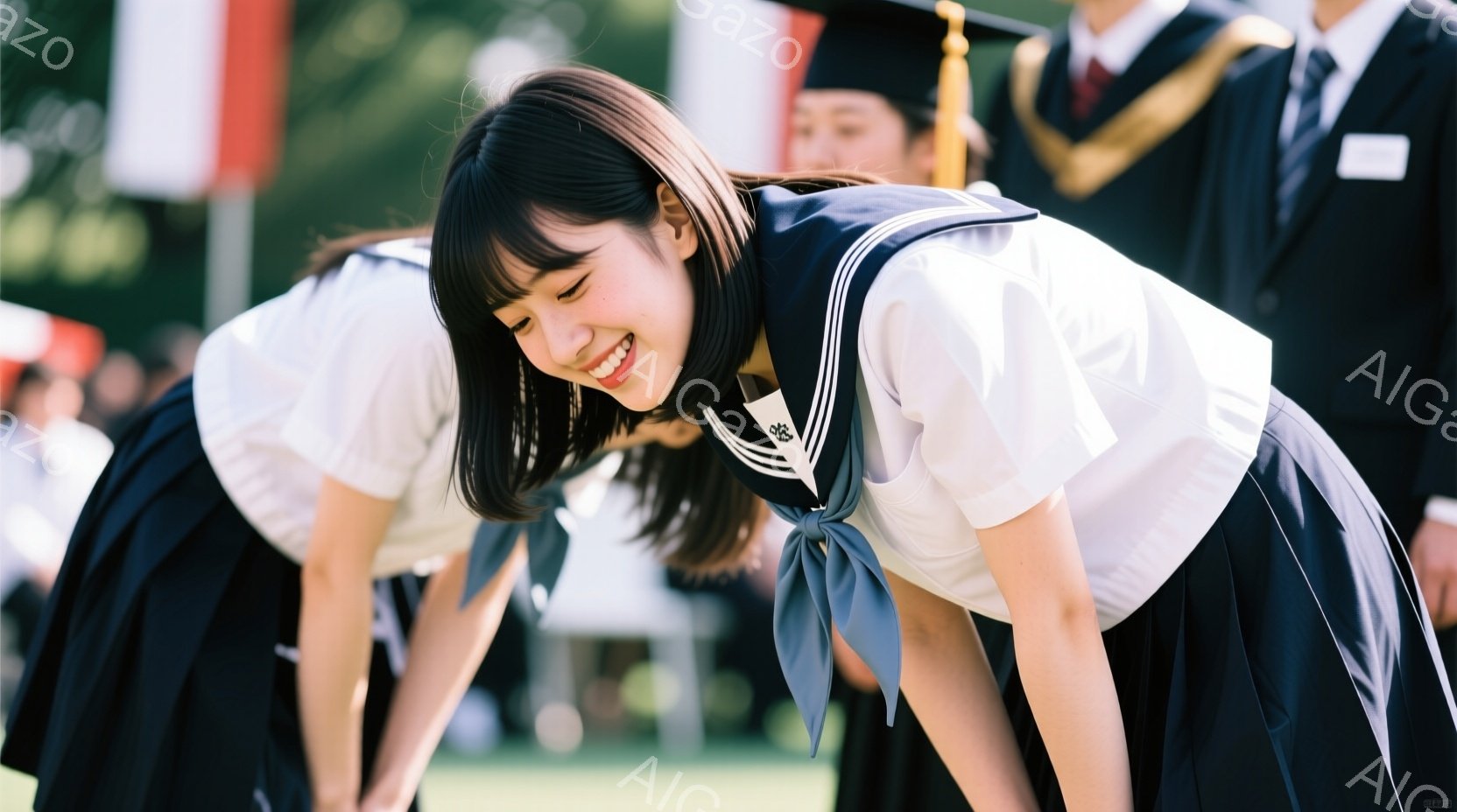 制服姿の女性が笑顔で深々と頭を下げています。彼女は黒いスカートと白いブラウス、灰色のリボンを身につけ、前髪を少し長めに残したヘアスタイルです。背景には黒いガウンを着た人々や木々が見え、晴天の下、卒業式のようなお祝いの雰囲気を感じさせます。