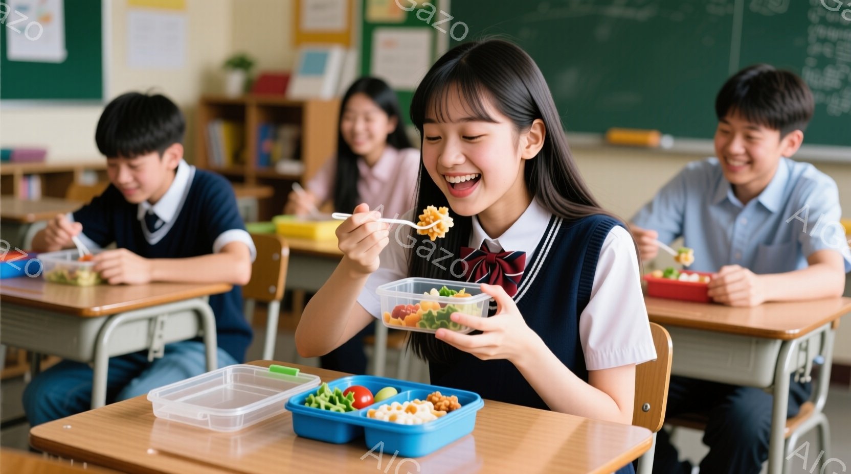制服を着た女子生徒たちが教室で昼食をとっている様子が写っている。彼女たちは皆、明るい笑顔で、お弁当箱からフォークを使って食事を楽しんでいる。教室は木製の机と椅子で整えられ、窓からは自然光が差し込み、活気にあふれた雰囲気である。
