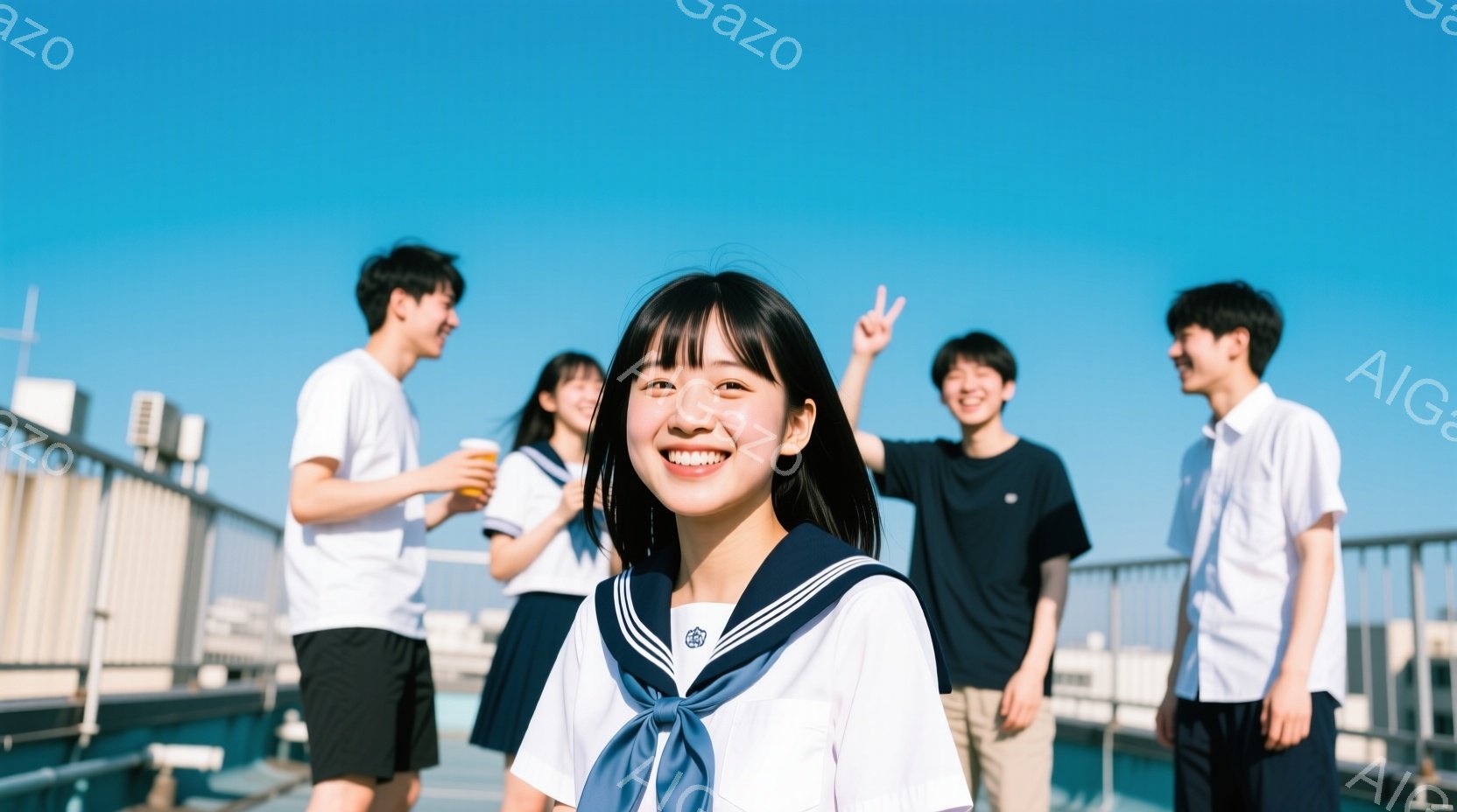 制服姿の女子高生二名と男子生徒一名が、屋上の開放的な空間で楽しそうにしている様子が写っています。女子生徒たちはセーラー服を着ており、紺色のスカートと白いブラウスが印象的です。男子生徒は白いシャツにズボン姿で、片手を上げて笑顔を見せており、晴天の下、明るく活気のある雰囲気が伝わってきます。