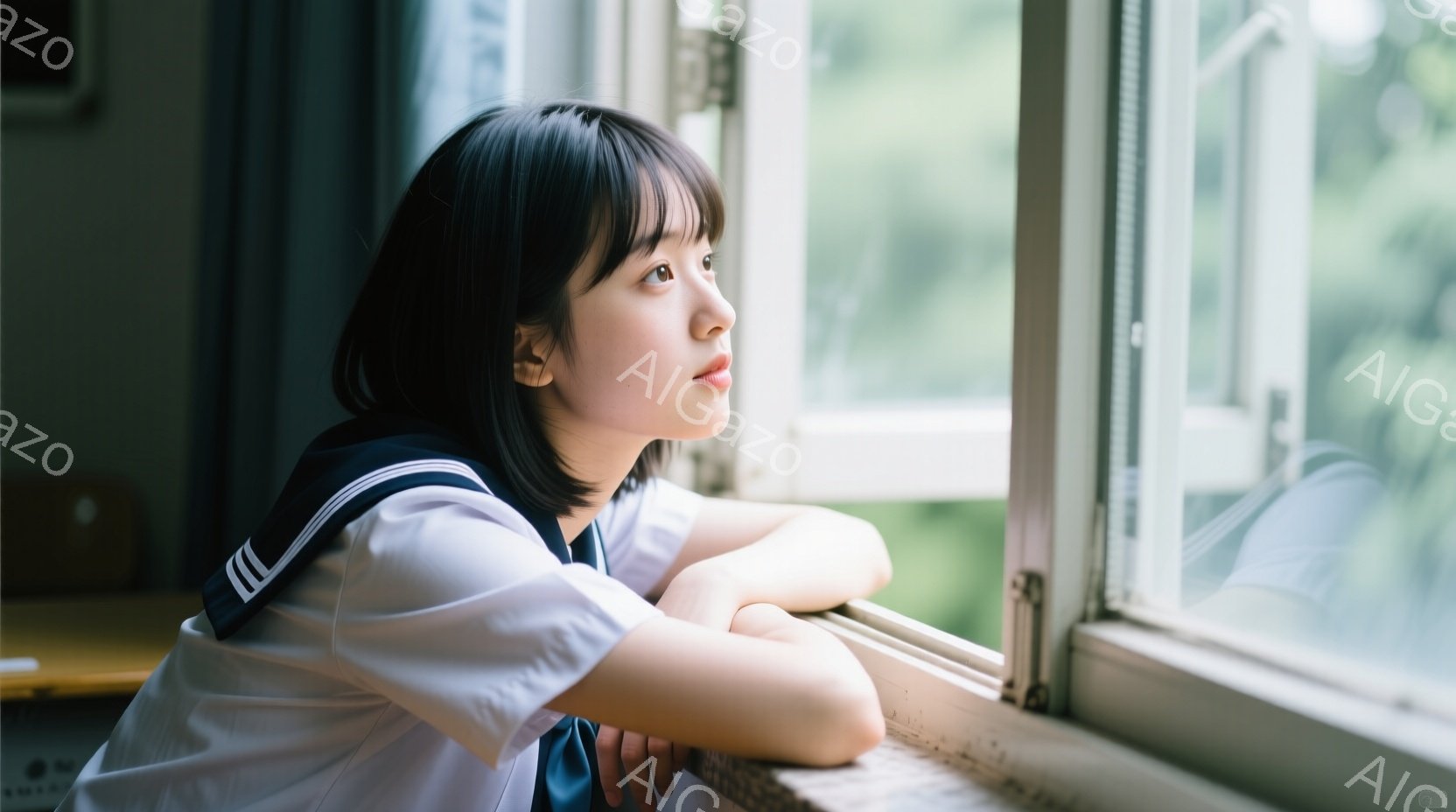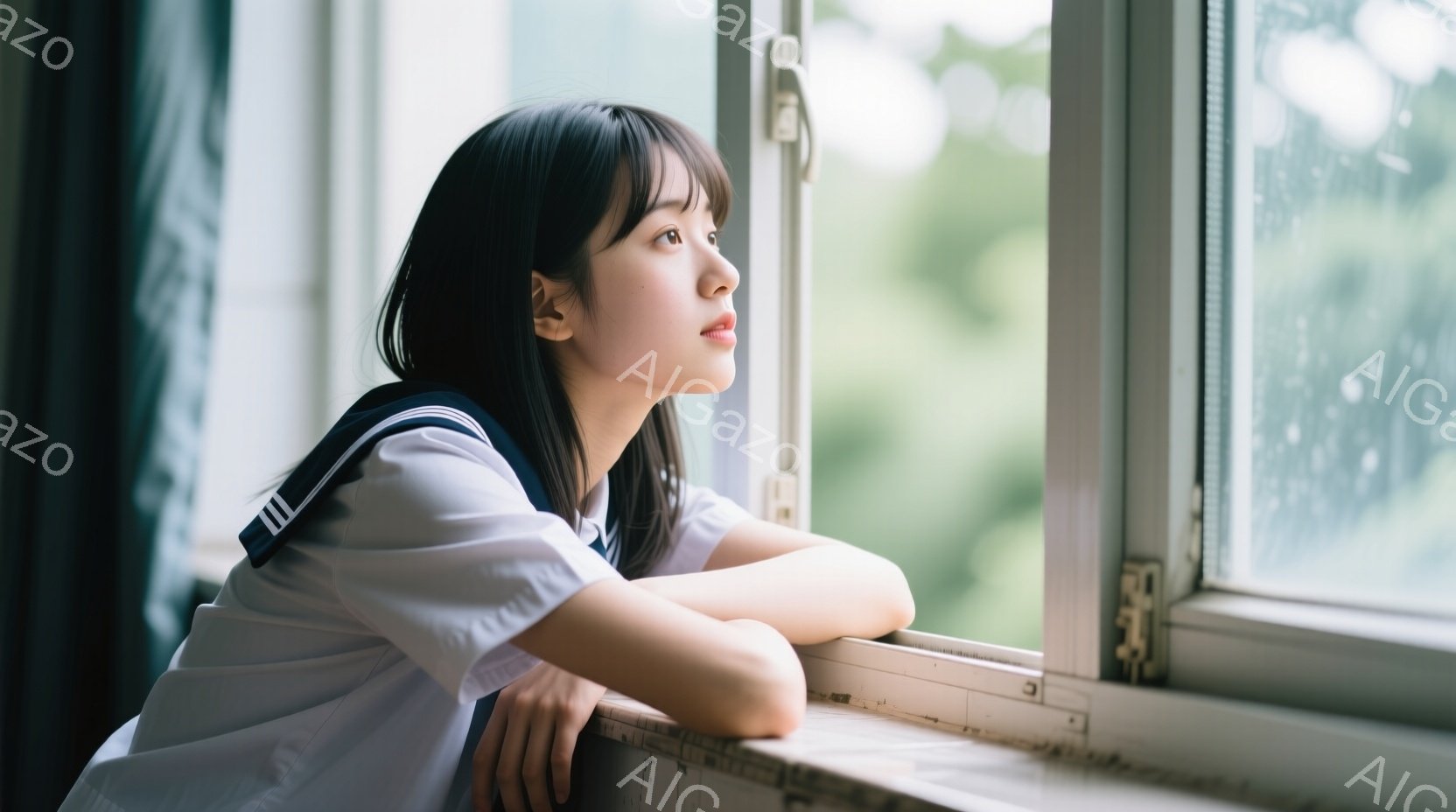 窓枠に肘をついて外を眺めている女子高生が写っています。彼女は黒髪のショートボブで、白いブラウスと紺色の制服を着ています。窓の外は雨が降っており、ぼやけた建物の風景が見え、物憂げな雰囲気を醸し出しています。