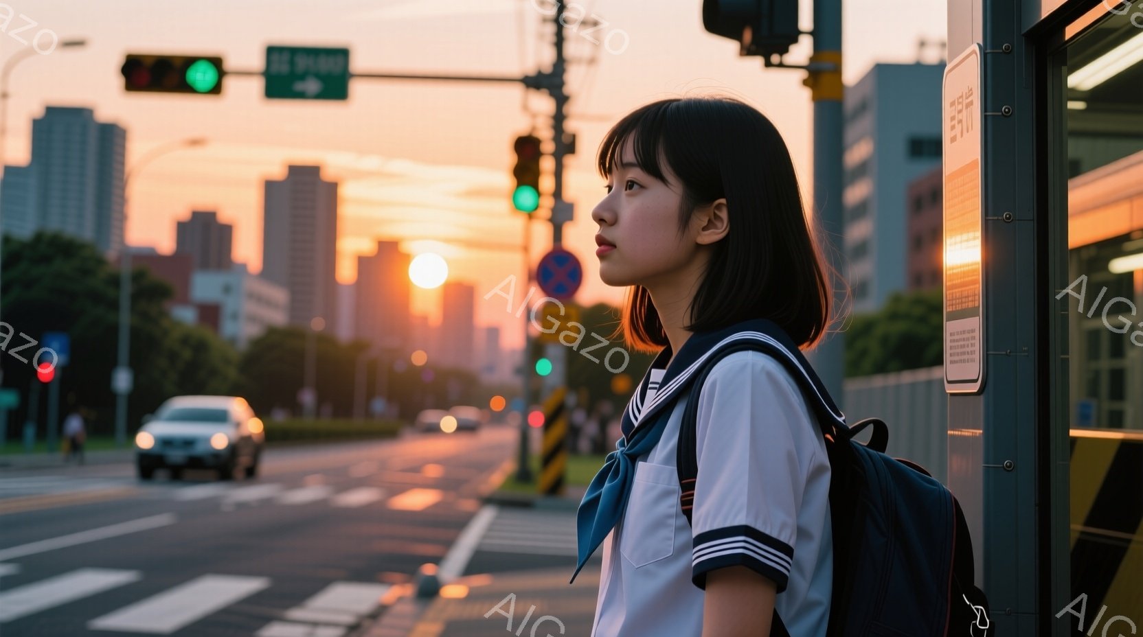 制服姿の若い女性が、鉄道のプラットフォームに立っている。彼女は黒髪で、少し内側に入った前髪を持ち、横を向いて遠くを見つめている表情はどこか物憂げだ。背景には夕焼けに染まる都市の風景が広がり、プラットフォームの柵に手をついて立っている彼女の姿が、寂しげでノスタルジックな雰囲気を醸し出している。
