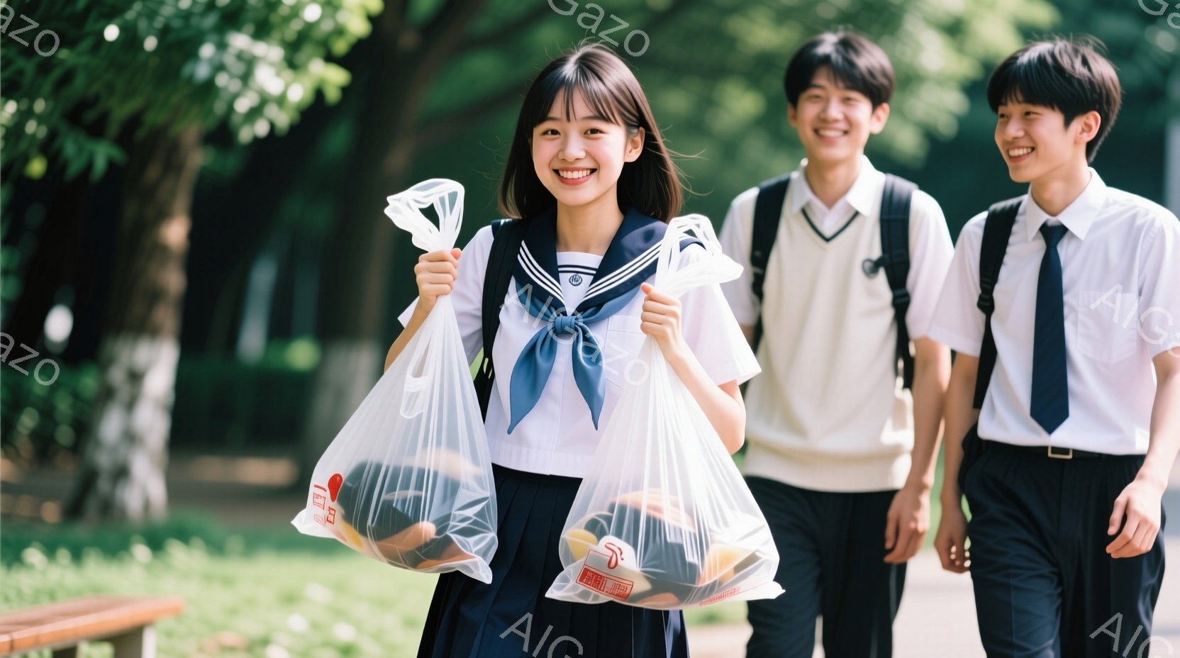 制服を着た女子高生が、スーパーマーケットのレジ袋いっぱいの買い物を抱え、笑顔で歩いている。彼女の髪は肩まで伸びており、前髪は少しふさふさとしている。背景には、同じ制服を着た男子生徒が二人おり、晴れた日の校舎や緑豊かな木々が見える、明るく活気のある雰囲気である。