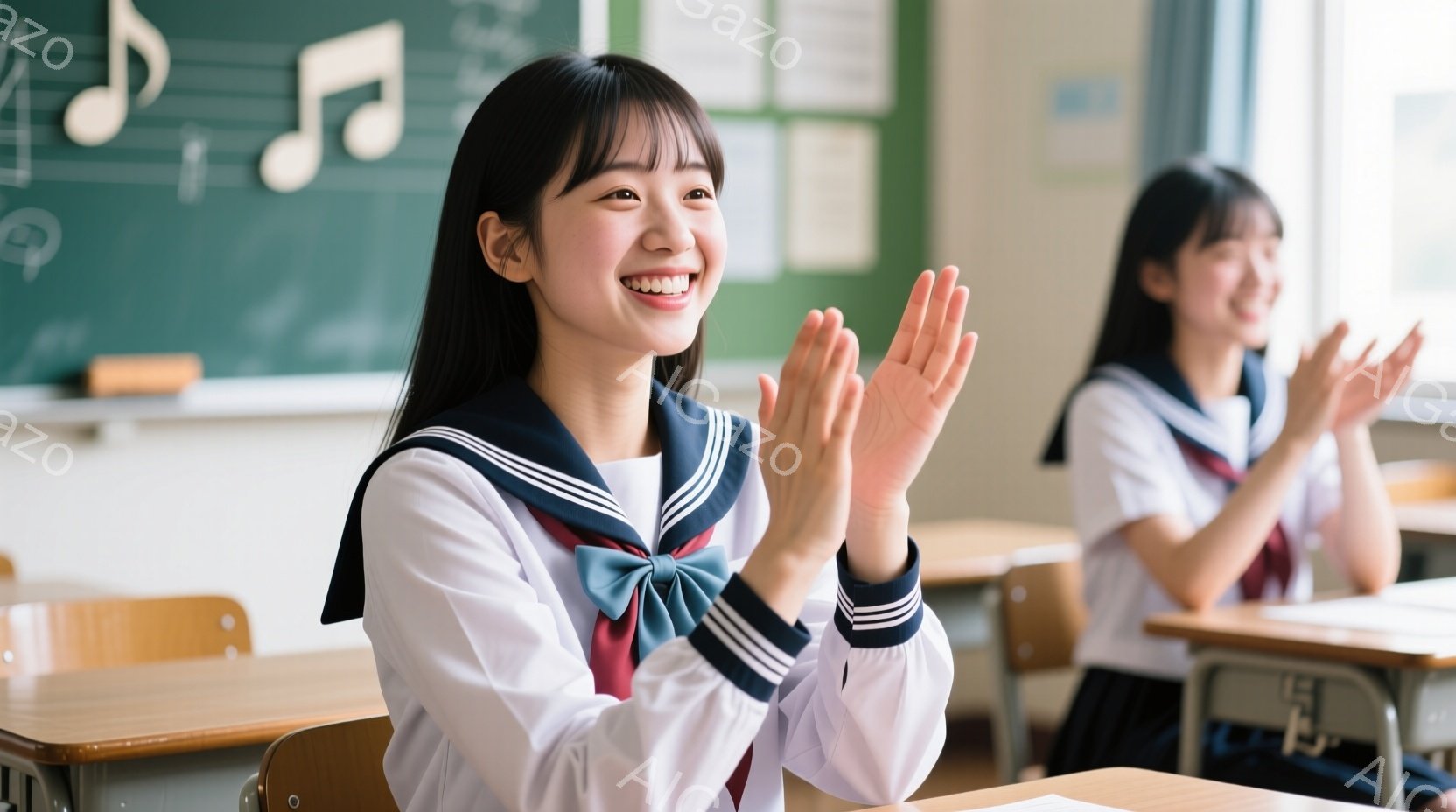 女子が紺色のベスト、白いシャツ、チェックのネクタイを着用し、マイクに向かって歌っている。彼女は髪をポニーテールにし、明るい笑顔を見せており、他の生徒たちも楽譜を見ながら歌っている様子が見える。背景には他の生徒たちがおり、教室のような場所で、活気にあふれた合唱の雰囲気が伝わってくる。