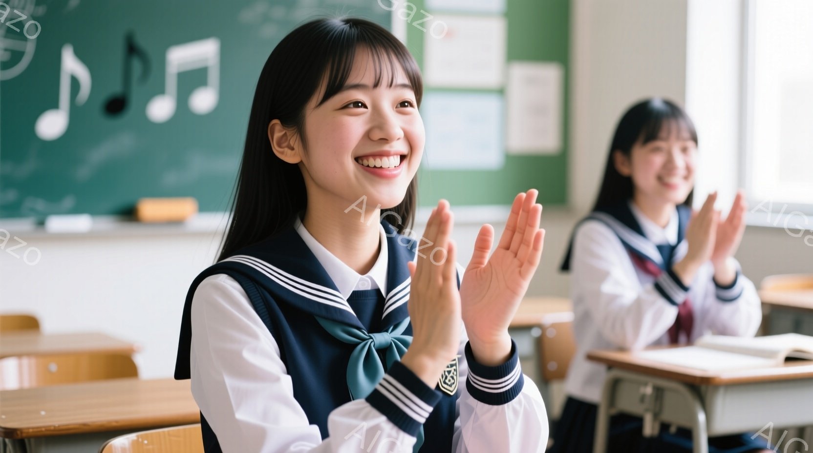 制服を着た女子学生が教室で拍手をしている様子が写っている。彼女は黒髪のショートボブで、満面の笑みを浮かべ、嬉しそうな表情をしている。背景には黒板があり、音符やポスターが貼られており、明るく活気のある教室の雰囲気が伝わる。