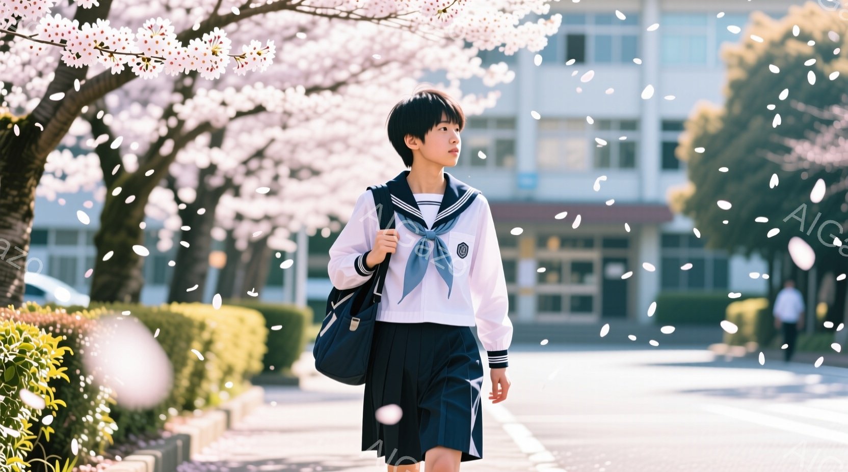 制服を着た男の子が、桜の花びらが舞う道を歩いている。彼は紺色のブレザー、白いシャツ、短いズボン、白いソックス、黒い靴を履き、首にはネクタイをしている。背景には学校の建物と、満開の桜並木があり、明るい春の陽気に満ちた雰囲気を醸し出している。