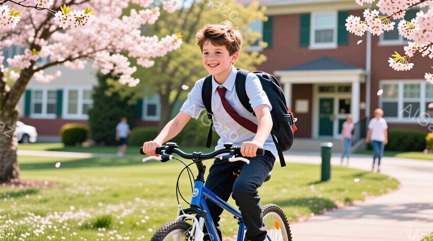 若い少年が自転車に乗って校庭を走っている。彼は青いシャツにネクタイ、短パン、白い靴下を履き、赤いバックパックを背負っている。背景にはレンガ造りの建物と満開の桜並木があり、晴れた空の下、春の暖かさを感じさせる。