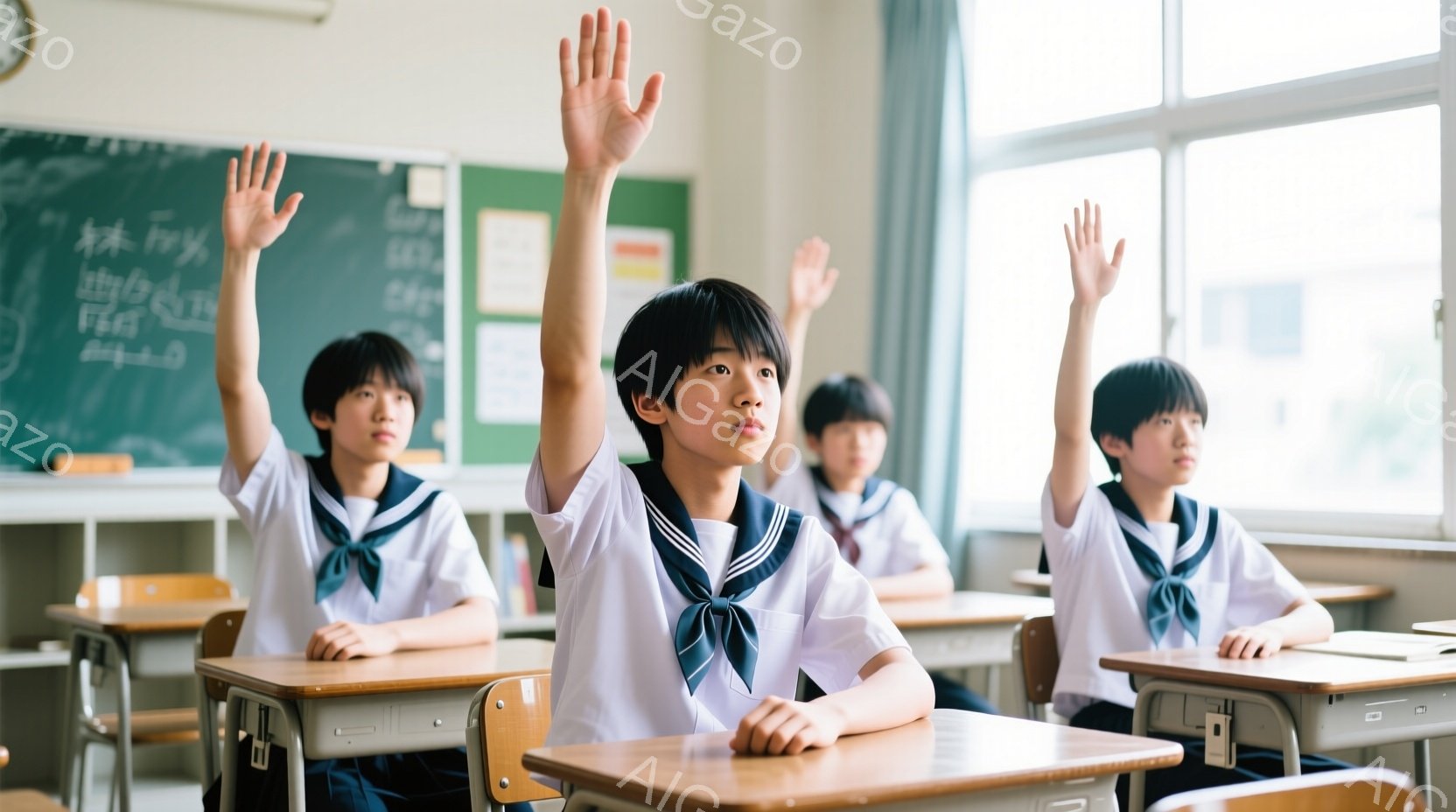 若い男性が教室で机に向かい、ペンでノートに書き込んでいる。彼は白いシャツと黒いベストを着ており、黒髪を短く整えている。教室には木製の机が並び、窓から自然光が差し込み、学習に集中した静かな雰囲気が漂っている。