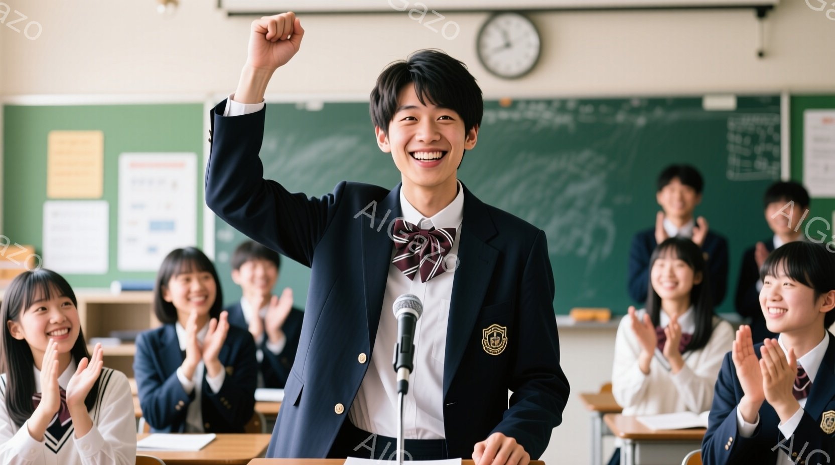 男の子が教室でマイクを手に立っており、やや緊張した表情で何かを読み上げているようだ。彼は水色のシャツにネクタイ、ズボンを着用し、茶色の髪は短く整えられている。背景には他の生徒たちが机に向かって座っており、黒板には文字が書かれている、学校の教室の様子が伺える。