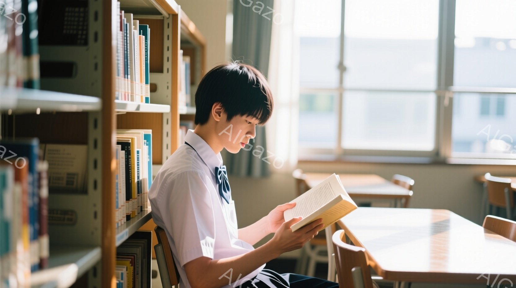 制服を着た男子学生が、図書館らしき場所で本を読んでいる。彼は黒髪で、姿勢よく椅子に座り、真剣な表情で本に集中している。背景には本棚が並び、窓から自然光が差し込み、静かで落ち着いた雰囲気を醸し出している。