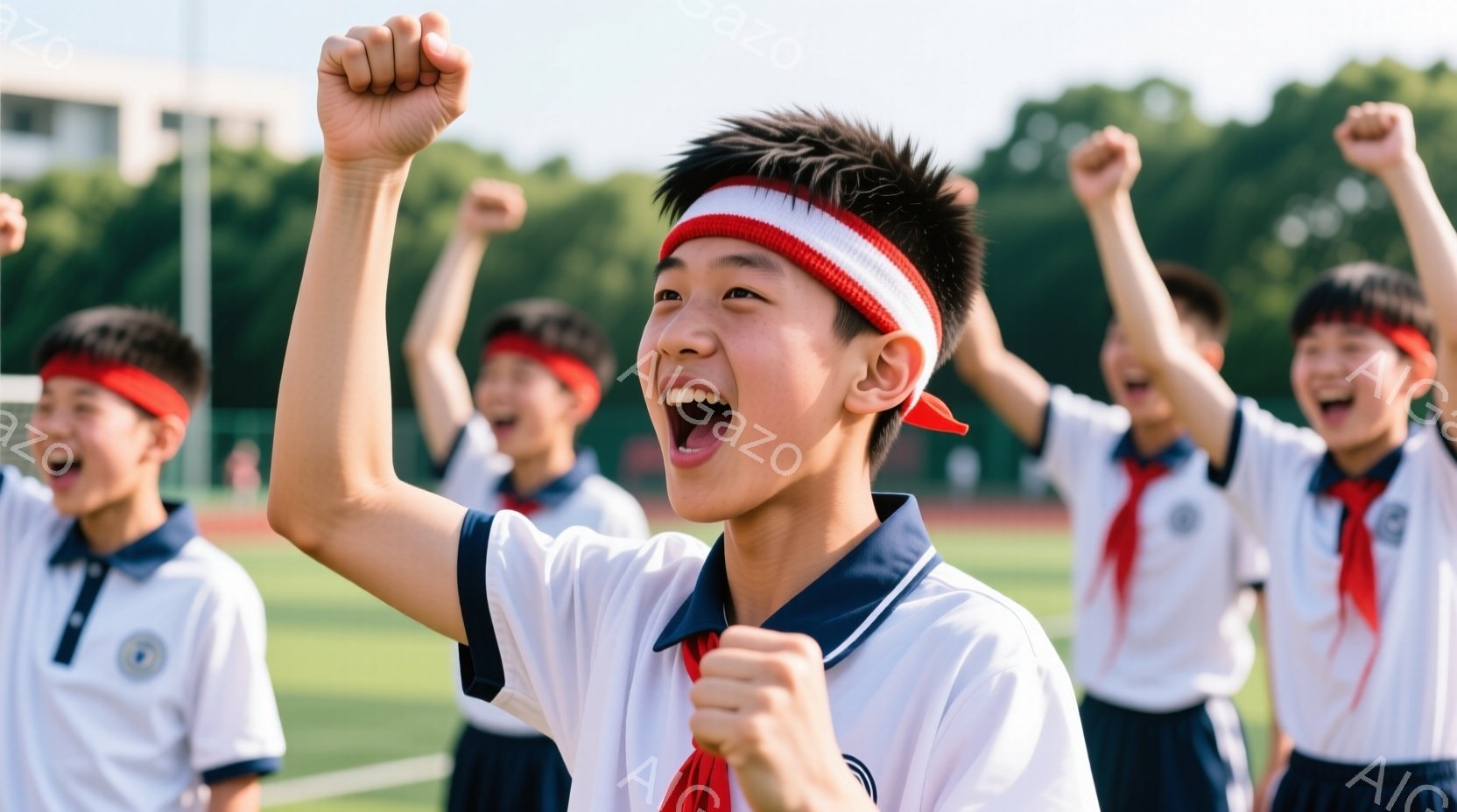少年たちは白いサッカーシャツに赤いバンダナを身に着け、両手を高く上げて勝利を祝っている様子が写っている。彼らは皆、満面の笑みを浮かべ、興奮と喜びにあふれた表情を見せている。背景には緑の芝生とサッカーゴールがあり、晴れた日の屋外でチームが勝利を分かち合っている活気に満ちた雰囲気が伝わってくる。