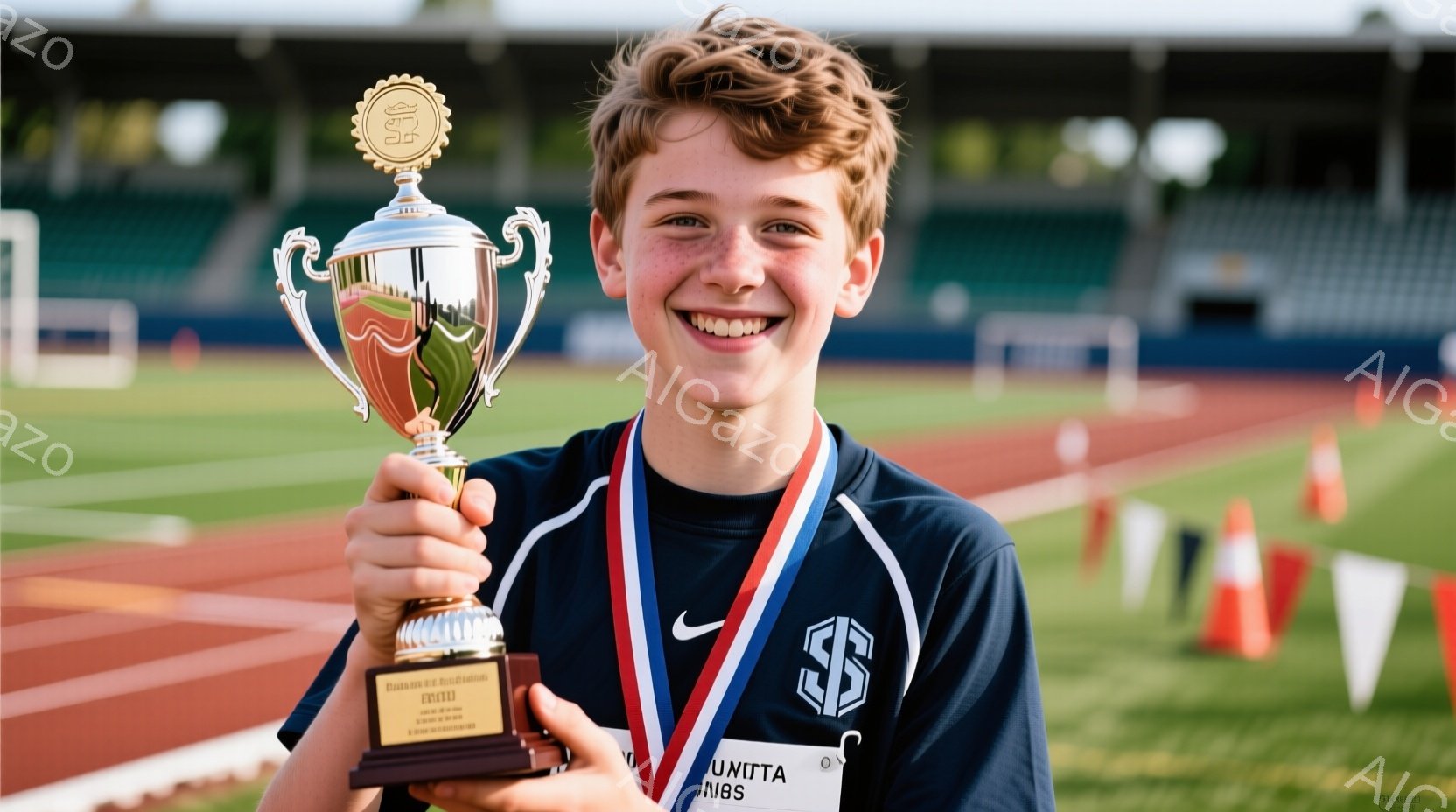 若い男の子が、競技場でトロフィーを掲げ、満面の笑みを浮かべている。彼は白いTシャツと紺色のビブスを着用し、首にはメダルが掛かっている。背景には緑の芝生とランニングトラック、そしてぼんやりとした建物が見え、晴れた日の屋外競技の様子が伝わる。