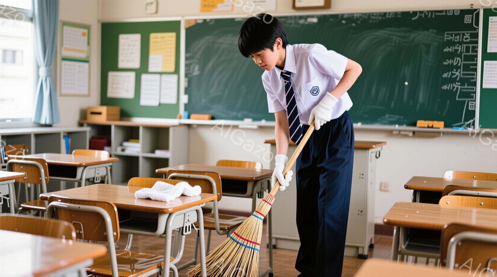 制服を着た少年が教室でほうきで掃き掃除をしている。紺色のズボンと白のシャツにネクタイを締め、スニーカーを履いている。教室の黒板には絵が描かれており、机と椅子が整然と並んでいる。