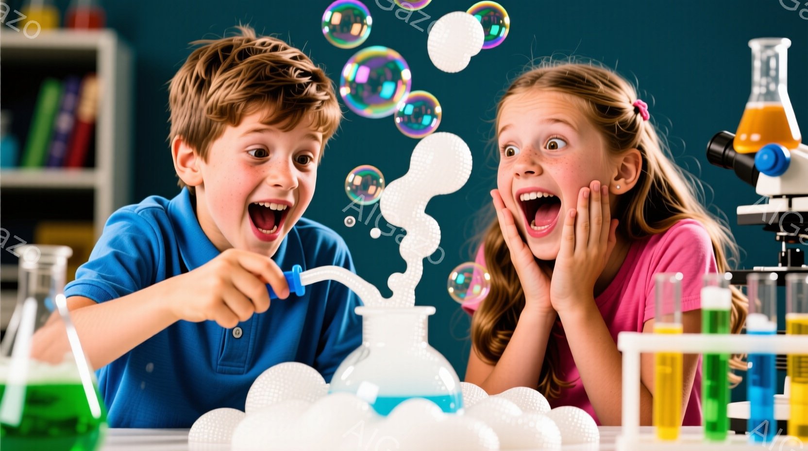 少年と少女は、実験で泡が吹き出した様子に驚き、満面の笑みを浮かべている。少年は青いTシャツを着ており、少女は赤いTシャツを着ている。背景には、様々なフラスコや実験器具が並び、実験室のような環境がうかがえる。