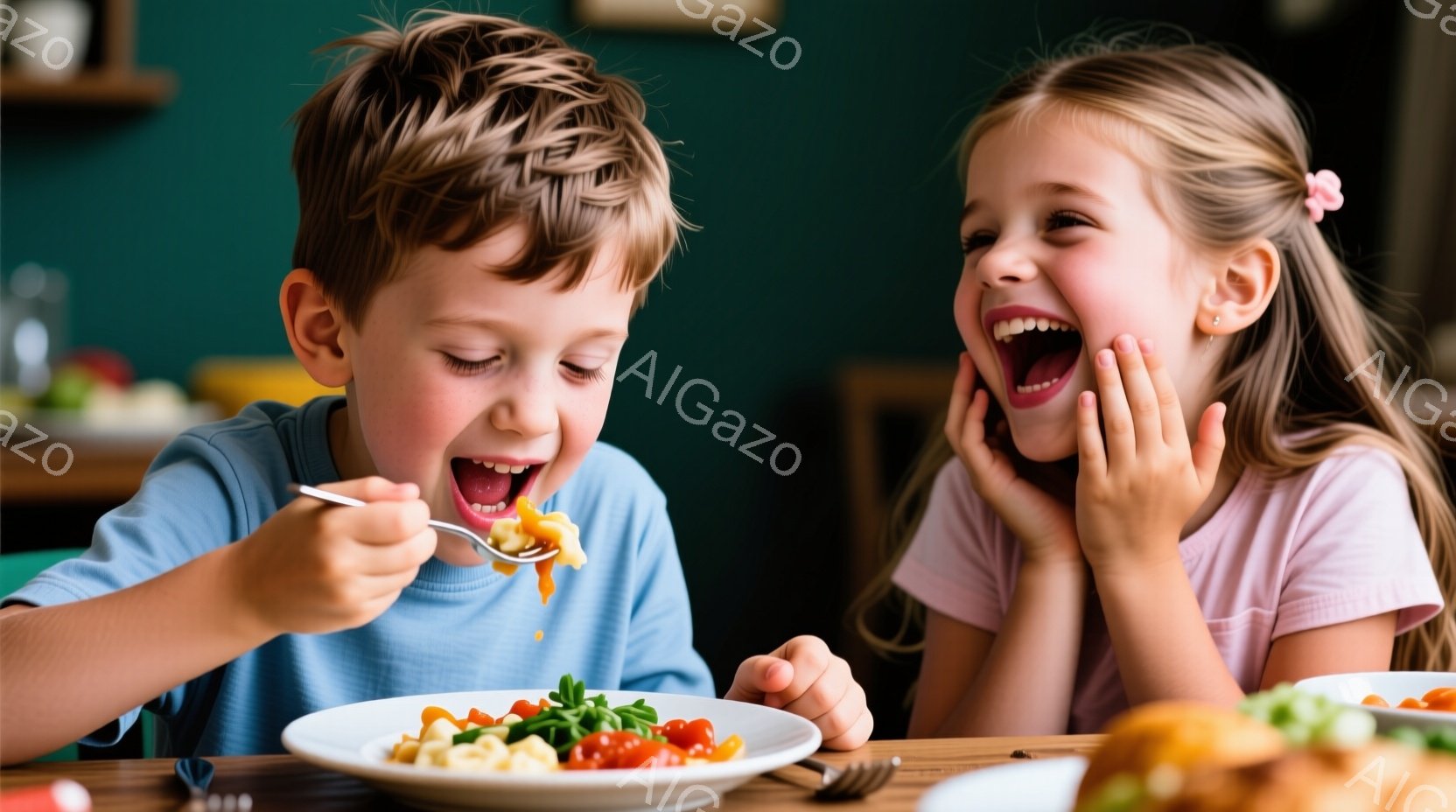 男の子は青いTシャツを着て、フォークでパスタを口に運んでいます。女の子はピンクのTシャツを着て、両手で頬を抱えながら満面の笑みを浮かべています。背景にはサラダが置かれた食卓と、柔らかな光が差し込む室内が見え、温かく幸せな雰囲気が漂っています。