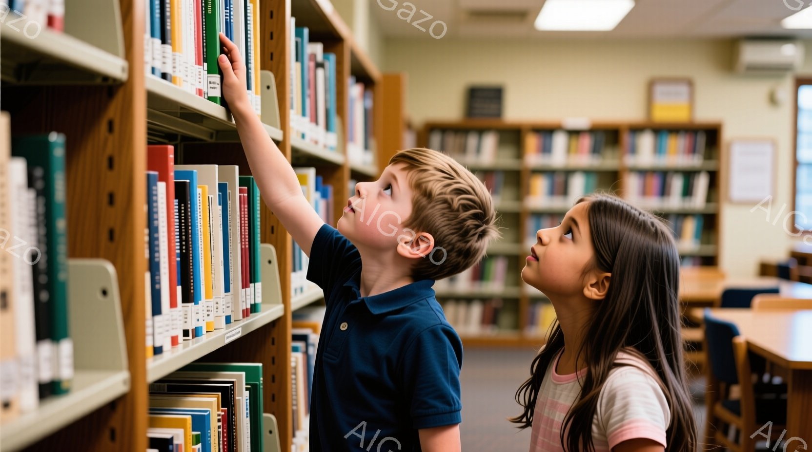 図書館の本棚の前で、少年と少女が本を探している。少年はストライプのシャツを着ており、腕を伸ばして高い棚の本に手を伸ばしている。少女は肩までの茶色の髪をしており、少し上目遣いで本棚を見上げている様子から、二人とも本に夢中になっている様子が伺える。