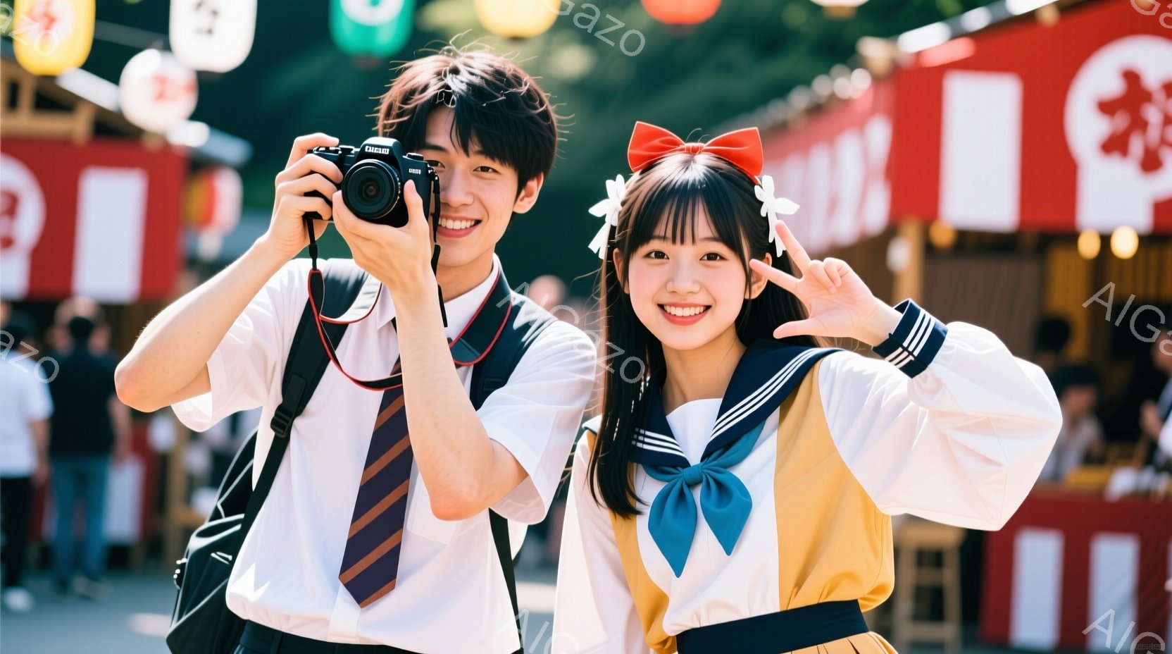 制服を着た若い男女が、赤い鳥居の前でカメラを向けて微笑んでいます。男性は黒いカメラを手に、女性は両手でハートマークを作っています。背景には他の参拝者や木々が見え、晴れた日の明るい雰囲気です。