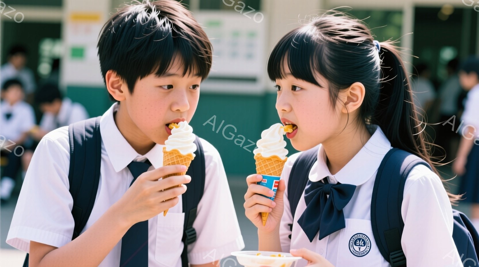 少年と少女は学校の敷地でアイスクリームを楽しんでいる。制服を着ており、少年は短い黒髪、少女はポニーテールで、どちらもアイスクリームに集中した表情をしている。背景には他の生徒や建物が見え、晴れた日の明るい雰囲気を感じさせる。
