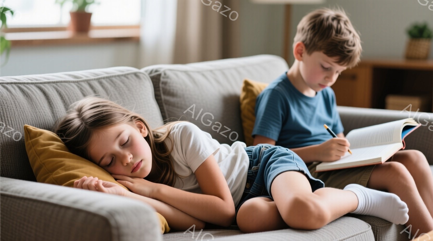 灰色のソファに横たわる少女と、本を読みながら勉強している少年が写っています。少女は白いTシャツとジーンズを着ており、目を閉じて眠っています。背景には木製の棚と観葉植物が見え、室内は明るく穏やかな雰囲気です。