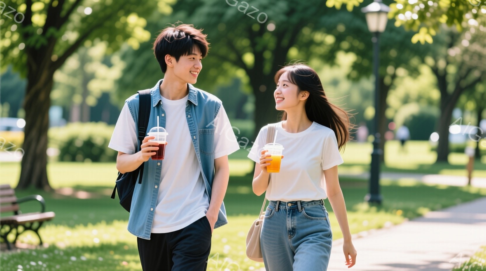 若い男女が公園の道を並んで歩いている。男性は水色のシャツに黒いズボンを着用し、女性は白いブラウスにデニムのショートパンツを身につけている。二人はそれぞれ飲み物を持っており、笑顔で互いに視線を合わせている様子から、明るく楽しい雰囲気が伝わってくる。