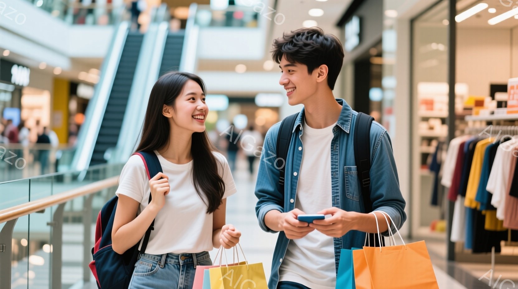 若い女性と男性がショッピングモールで寄り添って歩いています。女性は白いTシャツとデニムショートパンツを着て、リュックサックを背負い、ショッピングバッグを持っています。男性は青いシャツの上に白いTシャツを着て、コーヒーカップを持ち、同じようにショッピングバッグを持っています。