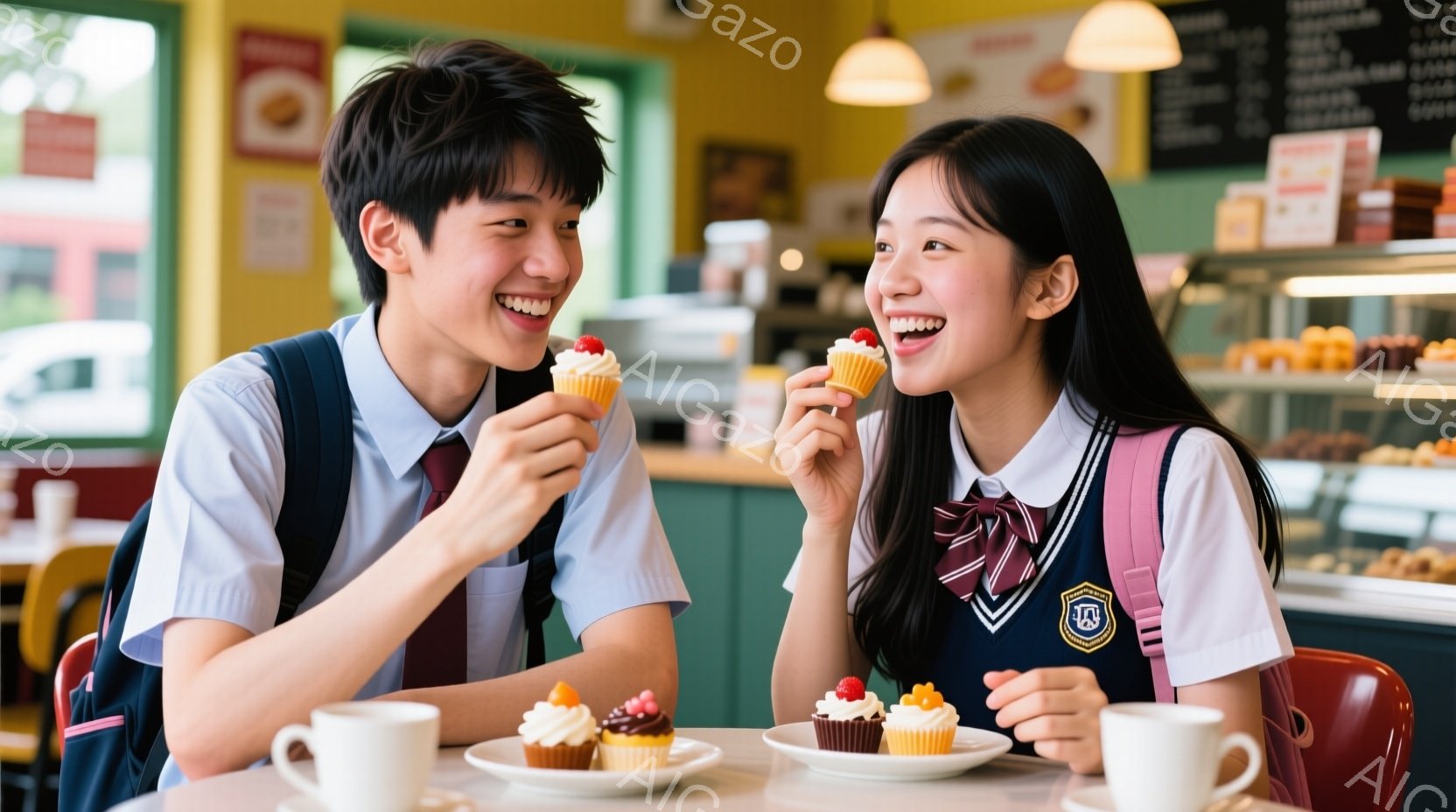 少年と少女は、カフェのような場所で、それぞれケーキを手に楽しそうに微笑んでいます。少年は巻き毛で、制服にネクタイをしており、少女は三つ編みで同じ制服を着ています。背景には、ケーキが並んだショーケースと、他の来店客が見え、明るく活気のある雰囲気です。